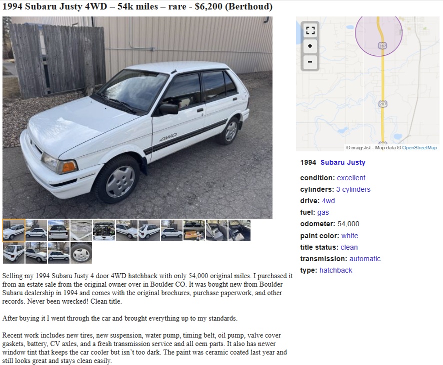 ECVT-equipped, this 1994 Subaru Justy is an interesting version of a small 4WD car. The four-door version was only offered from 1990 to 1994, and they all had 4WD, as shown here. This nice-looking example has a surprise inside, and it’s listed here on craigslist in Berthoud, Colorado, where the seller is asking $6,200. Here is the original listing, and thanks to Jack M. for the tip!