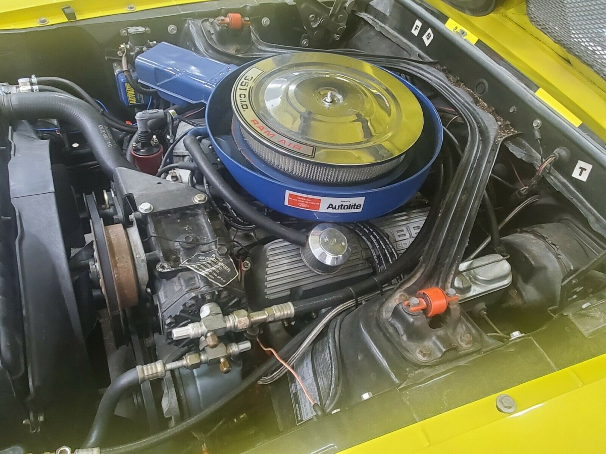 The Shelby is said to have its numbers matching Ford 351 cubic inch V8 engine that is fed through a four barrel carburetor. The Marti Report shows that it was built in May 1969 and had a blacked out hood. Rear axle is equipped with a 3.00 to 1 gear ratio. All GT350 cars were built with the small black Ford engines (351 cid) while GT500 Shelby’s were built with big block engines (428 cid). The engine compartment appears to be in good condition and no rust is evident.