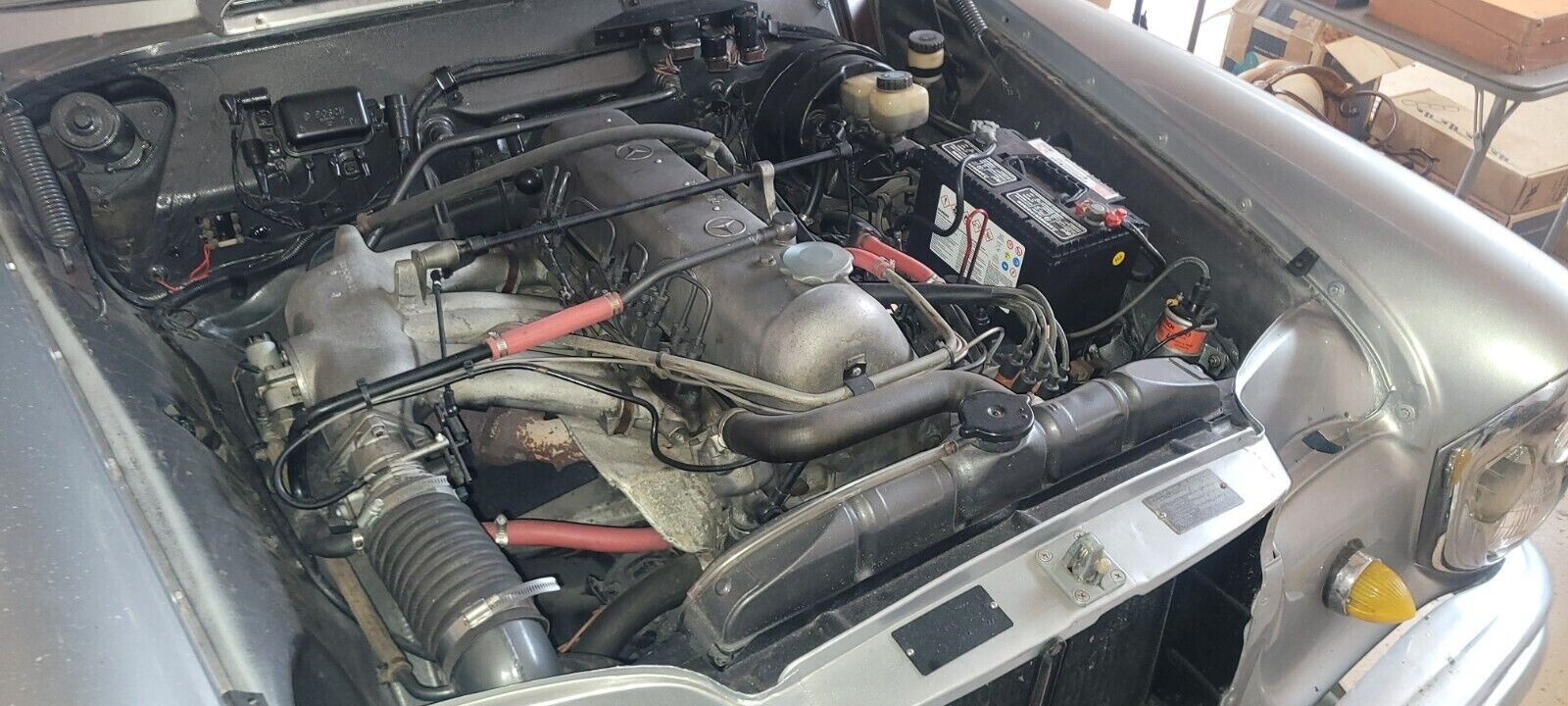 Behind that untouched M-B grille, is a 118 HP, 2.2 liter, in-line six-cylinder engine, working in tandem with a four-speed manual transmission. The seller tells us that it, “runs and drives great“. Other than the inclusion of some red heater hose, the underhood reveal appears original and unmodified.