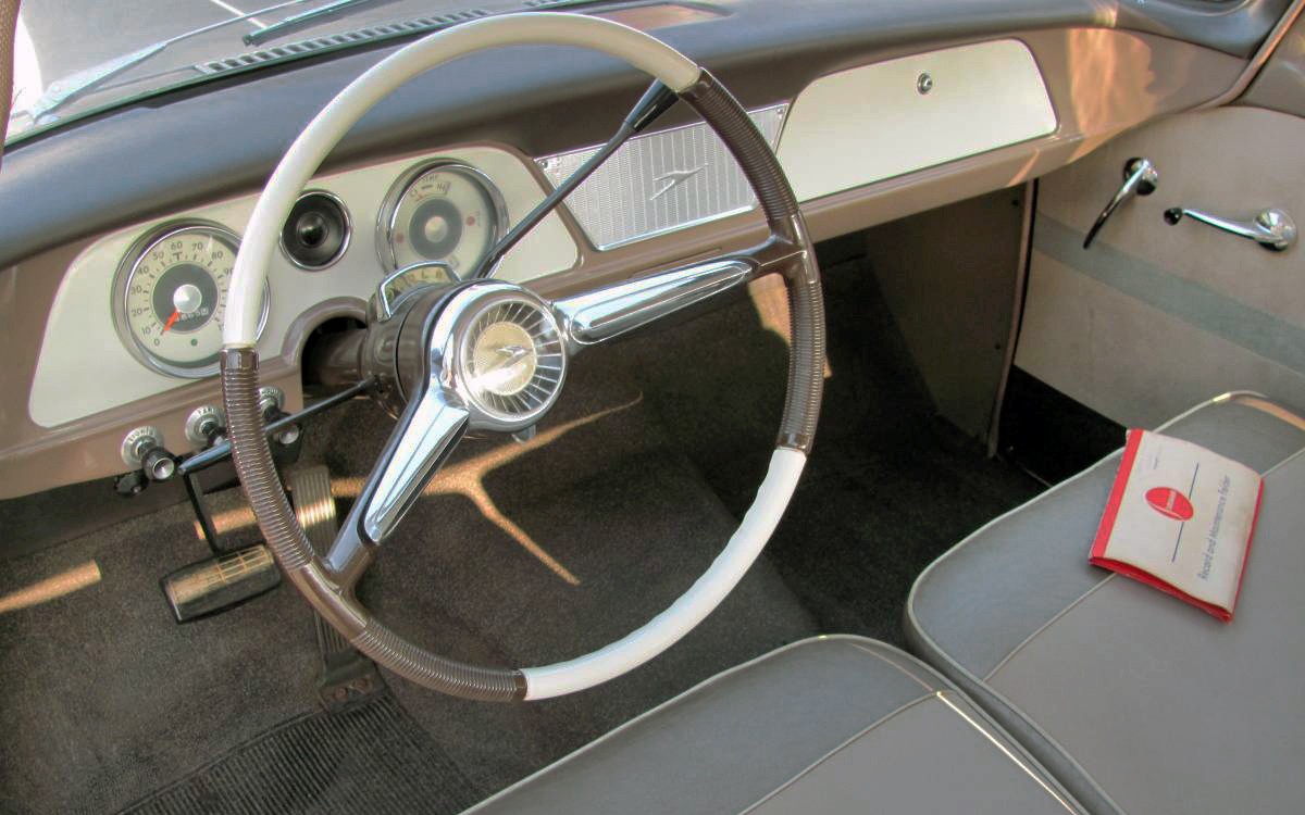 The interior shines as much as the exterior does on this Lark. This is a Deluxe model which was below both the Regal and Cruiser trim levels but it looks clean and crisp. The seats look as close to being new as possible both front and rear. One thing you may have noticed in the photo of the rear seat is that the original rubber flooring back there is cracked. That shouldn’t be hard to fix and if that’s the only problem with this car then you’re doing pretty well. Another option on this Deluxe model is an automatic transmission.