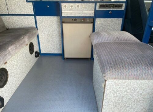 Of course, if you manage to damage one of the cabinets or kitchen appliances, you’re going to have to settle for the replacement not looking nearly as period-correct, but even that can be addressed with cosmetic fine-tuning. The seller describes what seems like very clever packaging inside including a bed portion in the expanded Reimo-brand roof along with seating surfaces that convert to a queen-size bed in the main passenger compartment. There’s a fridge, two-burner propane stove, stainless steel sink, and electric pump faucet. The standing room inside will accommodate a six-foot-tall passenger, and the seller also notes there is plenty of storage to be found in cleverly-packaged cubbies and cabinets.
