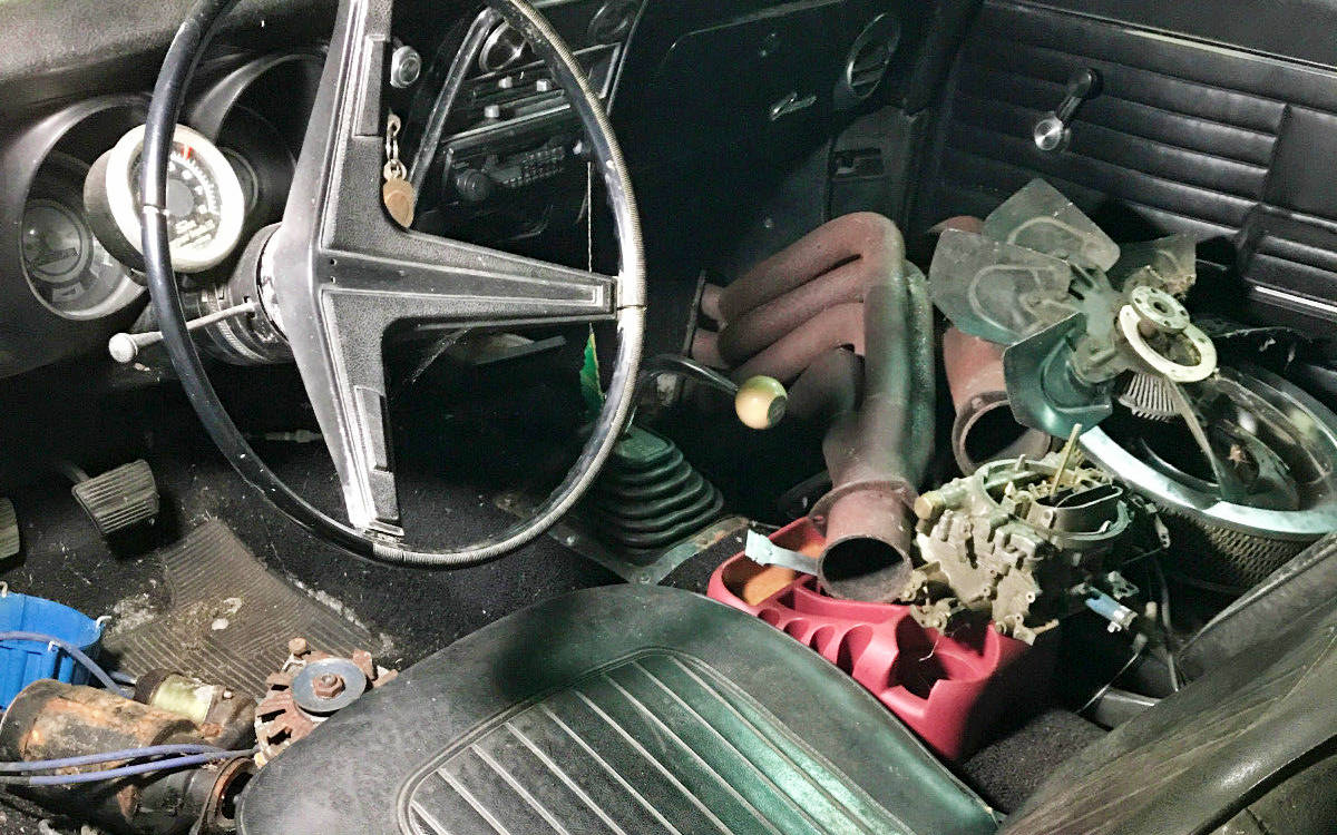 The interior looks to be in decent shape, although it needs to be cleaned out. By the looks of it, this Camaro was still on the road not that long. The cassette player and plastic cup holder suggest it may have been on the road in the ’90s. There are lots of engine parts stashed in here and given the seller’s statement about having parts for a 454, it’s probably safe to assume these parts are from a 454 and not the original 302.
