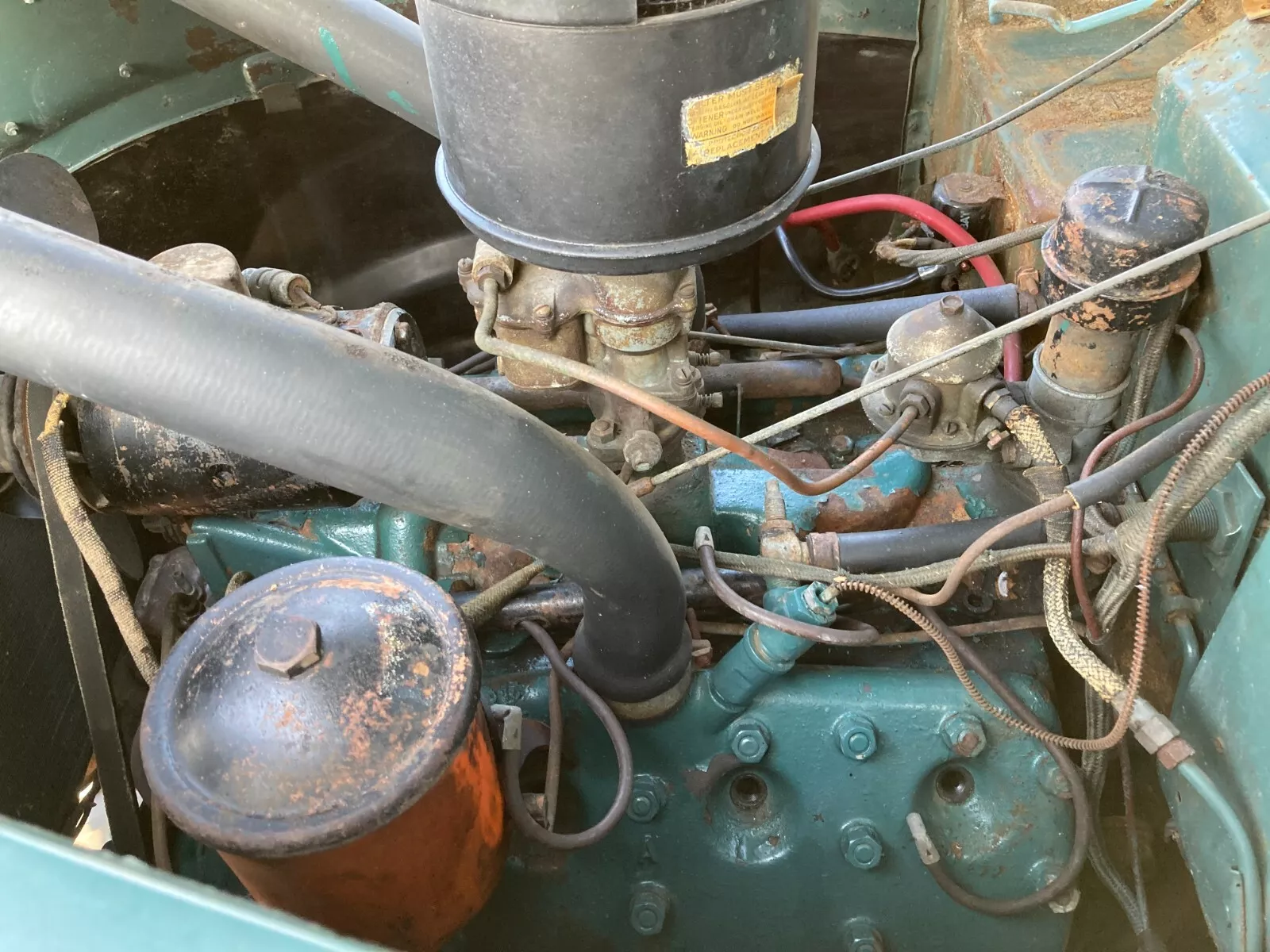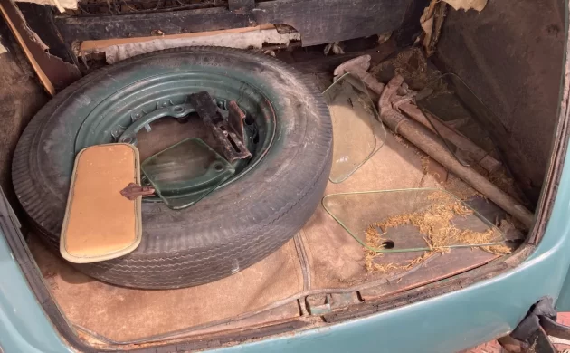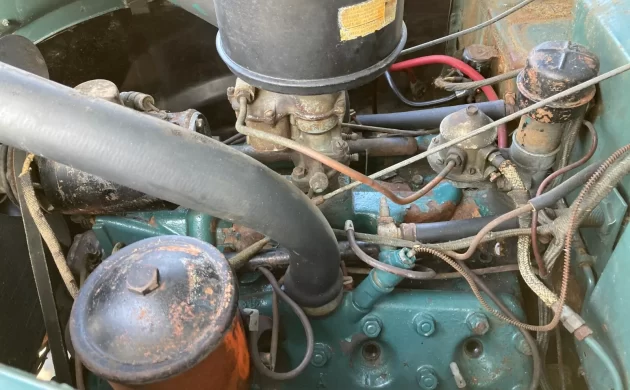 Looking into the engine compartment reveals an overabundance of the same paint used on the exterior of the car. The seller says that the engine compartment looks to be “untouched original.” Other than the paint issues, they may be correct given that the genuine Waltham Clock Company-made odometer shows a scant 39,884 miles. We have no way to know if that number is true, but the car does not appear to be a clapped-out high-mileage vehicle. The fact that it still wears the original wheels and, thus, the mechanical brakes Ford last used in 1938 is a big clue as well. Most likely poor storage left it in dire straits.