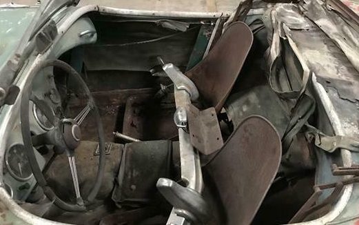 The diminutive interior is pretty well gutted. The seats are stripped and there is no floor covering but the floors, what can be spied, look sound. The door cards are in dilapidated condition and the steering wheel is missing some chunks. That said, the instruments show to be surprisingly clear. As with many sports cars of this era, there isn’t a lot of an interior to restore due to its compact size and austere nature. Some attention will need to be paid to that convertible top and frame as they are in a pretty shaky condition.