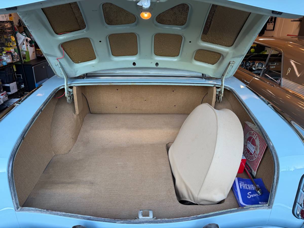 The interior was renovated in Ostrich leather, and aftermarket seat belts were installed. A faux convertible top look was popular in the 1950s, with stylists employing chrome strips in the headliner to mimic top frames. This one is slightly stained along one crease. A machine-turned dash sets off the round-dial gauges. All the instruments and electrical items are said to be in working order – except the clock, of course. The car is equipped with an optional tissue receptacle beneath the glove box. The trunk mat is original; even the trunk lamp is operational.