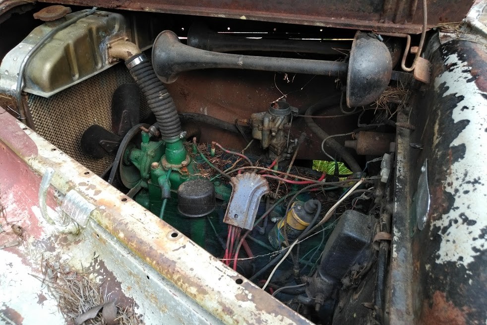 The engine color is wrong which either means a Sears rebuild or rattle can. Sears and Shieb sure kept a lot of families in transportation back then. My ’41 Dodge was the butt of all jokes. The Sears engine ran flawlessly for several owners after me. Whaddaya ‘spect for fifteen dollars?