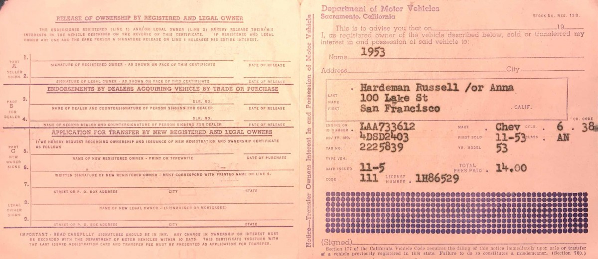What Makes It Special? This is a true one owner garage kept rust free California Bel Air. This Chevy was cared for and loved by a humble hero named “Russ”. Russell was a member of 101st Airborne Division during World War II. A loving father of three and husband to Anna. Russ was later known as the “Mayor” of 41st Ave in San Francisco’s Sunset District. Russ purchased the Chevy new from L. M. Schomer on Geary Blvd. Russ’ brother Luke and brother-in-law Bill had a couple service stations in the area, one of which was the West Portal Shell and later the Richfield Station at 9th and Bryant. Russ often took the car there for maintenance.