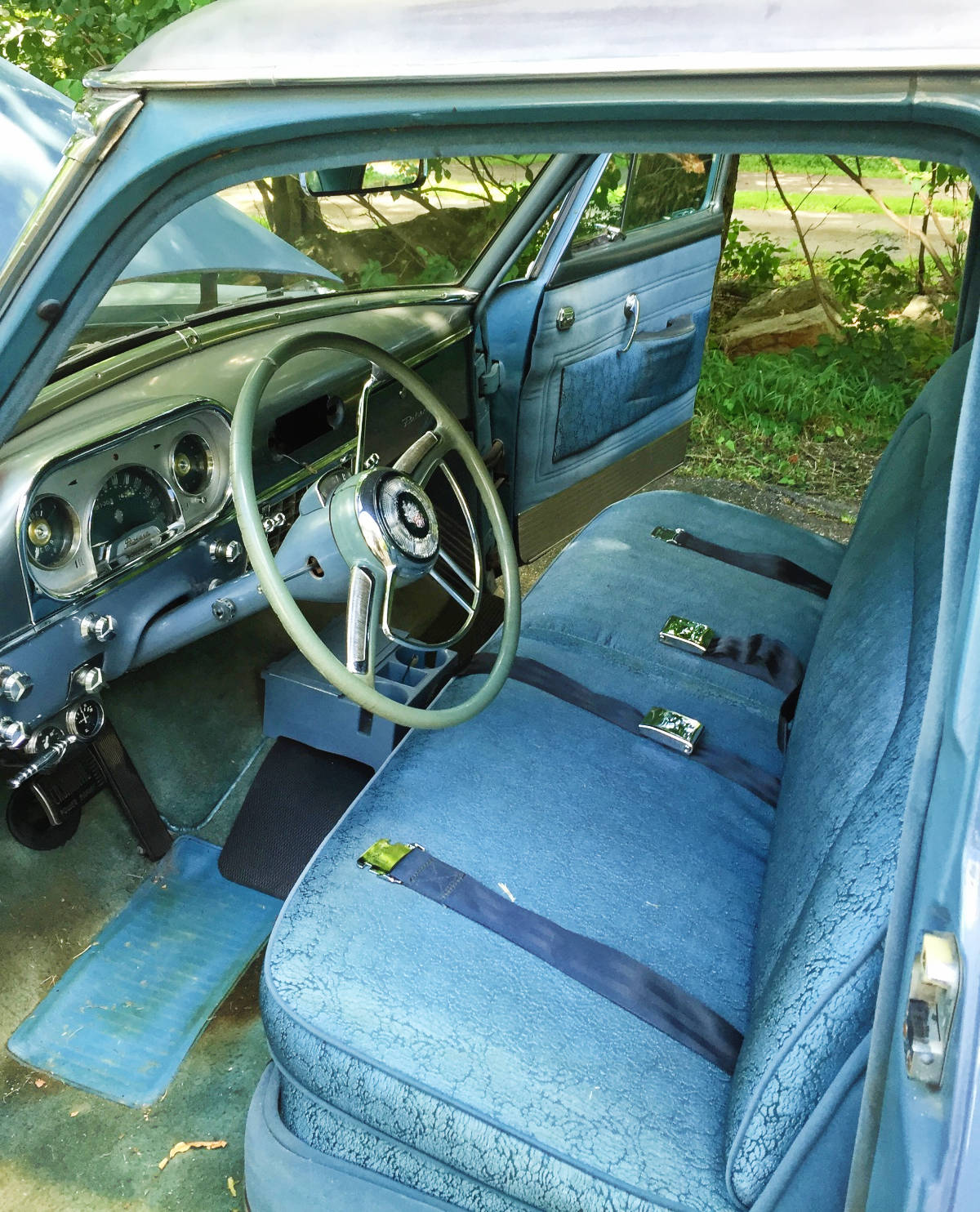 Hi, Nessy . . . I had an “Orchard Green” ’54 Patrician, with a white top, like yours. Unrestored, original, but my interior was much plainer, broadcloth, not the brocade. Your brocade interior is the nicest I’ve seen. Sold mine to a good friend about ten years ago, and he still enjoys it.