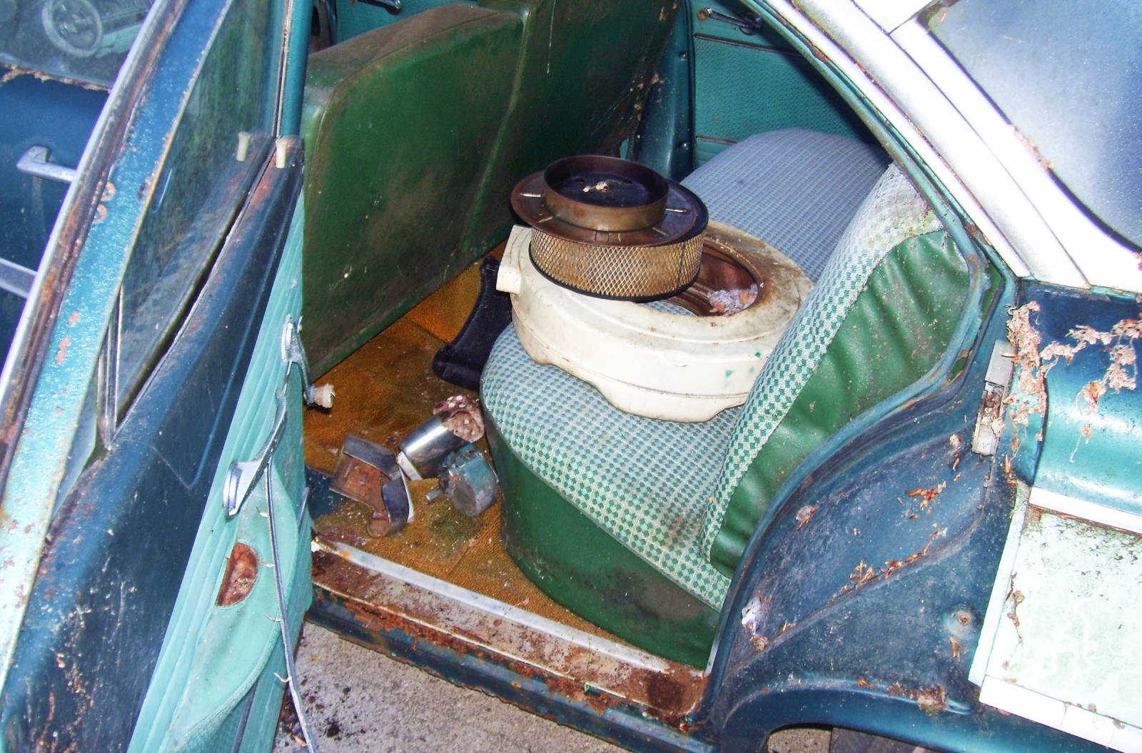 Final update, I hope. The car is back at our shop. Solid trunk floor, solid floor pans. Rusty rockers, lower quarters and door skins. Tire well does has rust but over all pretty solid. Motor is free, and we hooked up the battery and had lights, radio static, cigar lighter works too. lower radiator hose was busted so we fixed that and now the clean up. Time is running out, once we have it ready to clear coat, were keeping it. Thanks for all the entertaining comments.
