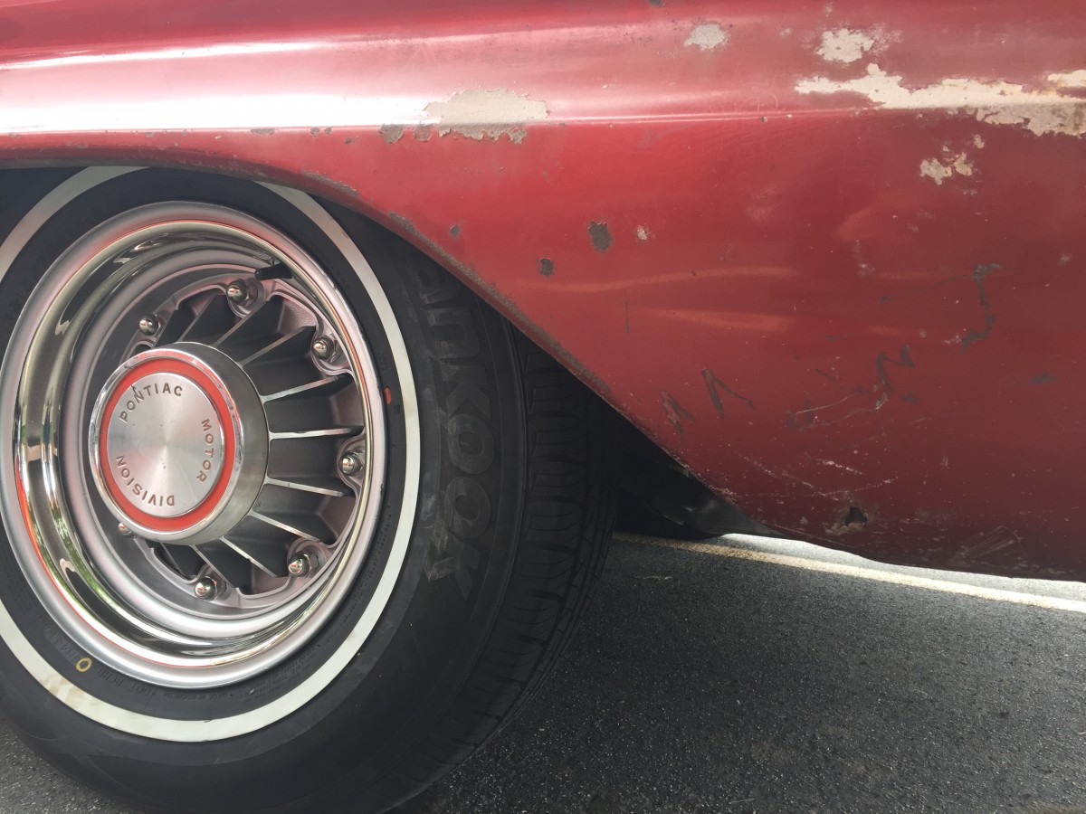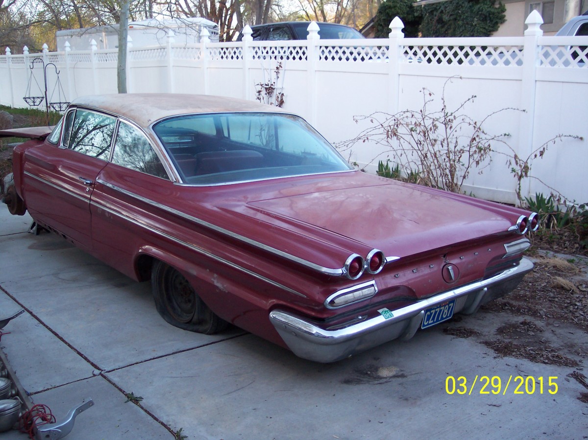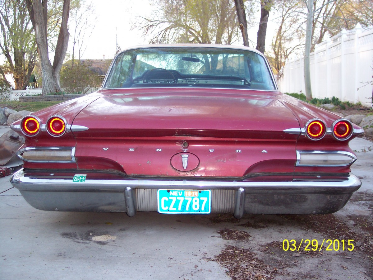 What Makes It Special? This Ventura is a survivor with some restoration to make it drivable. In March of 2015, the car was dragged out from a garage where it had been tucked away in the late 1970s. Prior to that, in 1975, the car was impounded by Nevada Highway Patrol and listed as an abandoned vehicle. It was sold as scrap to a wrecking yard then resold to the prior owner for a parts car. The prior owner decided to restore it and began by removing the front clip and started with bodywork to the driver’s side front fender. After poorly repairing the rust and sanding the fender he set the car aside and the years slipped by with the car being untouched for roughly 40 years. The car is equipped with power steering, power brakes, three-tone Morrokide vinyl bench seats, SoftRay tinted glass, original windshield, the courtesy light switch next to the radio, speaker switch for front and rear speaker volume control. Original interior. The original padded dash is in poor condition so a metal dash was painted and installed to match the color of the padded dash, then scuffed up to appear aged. The original padded dash is included for restoring. The car is also equipped with a full set of restored original 1960 8-lug wheels and drums with excellent metal brake linings, all new stainless steel lug nuts and trim rings (correct left hand and right hand threaded lug nuts). Center caps are original but someone painted the details red (should be black) but I left them that way for that 1970’s touch.