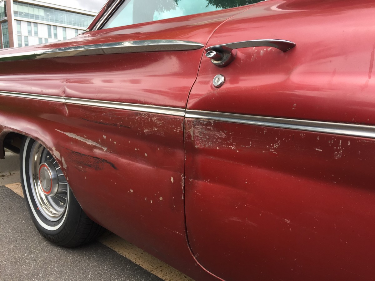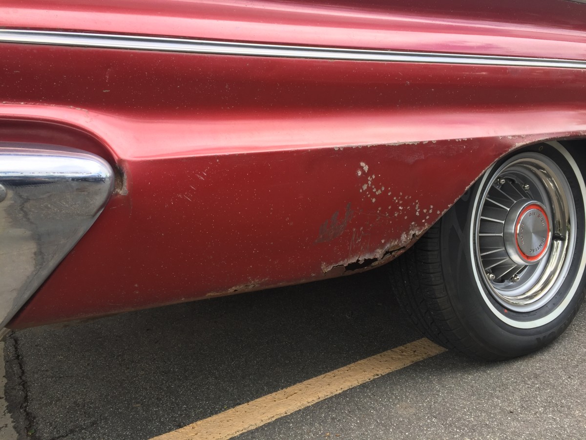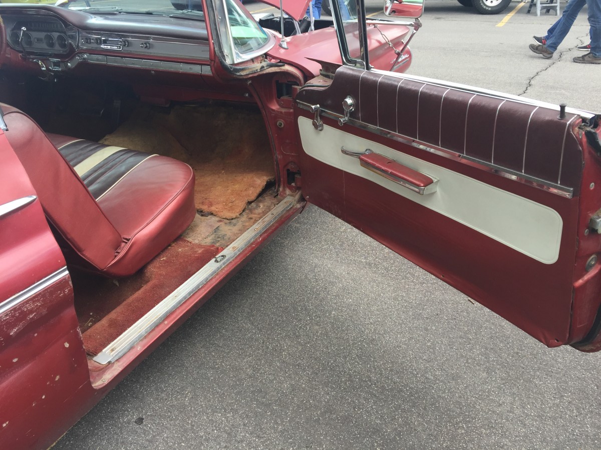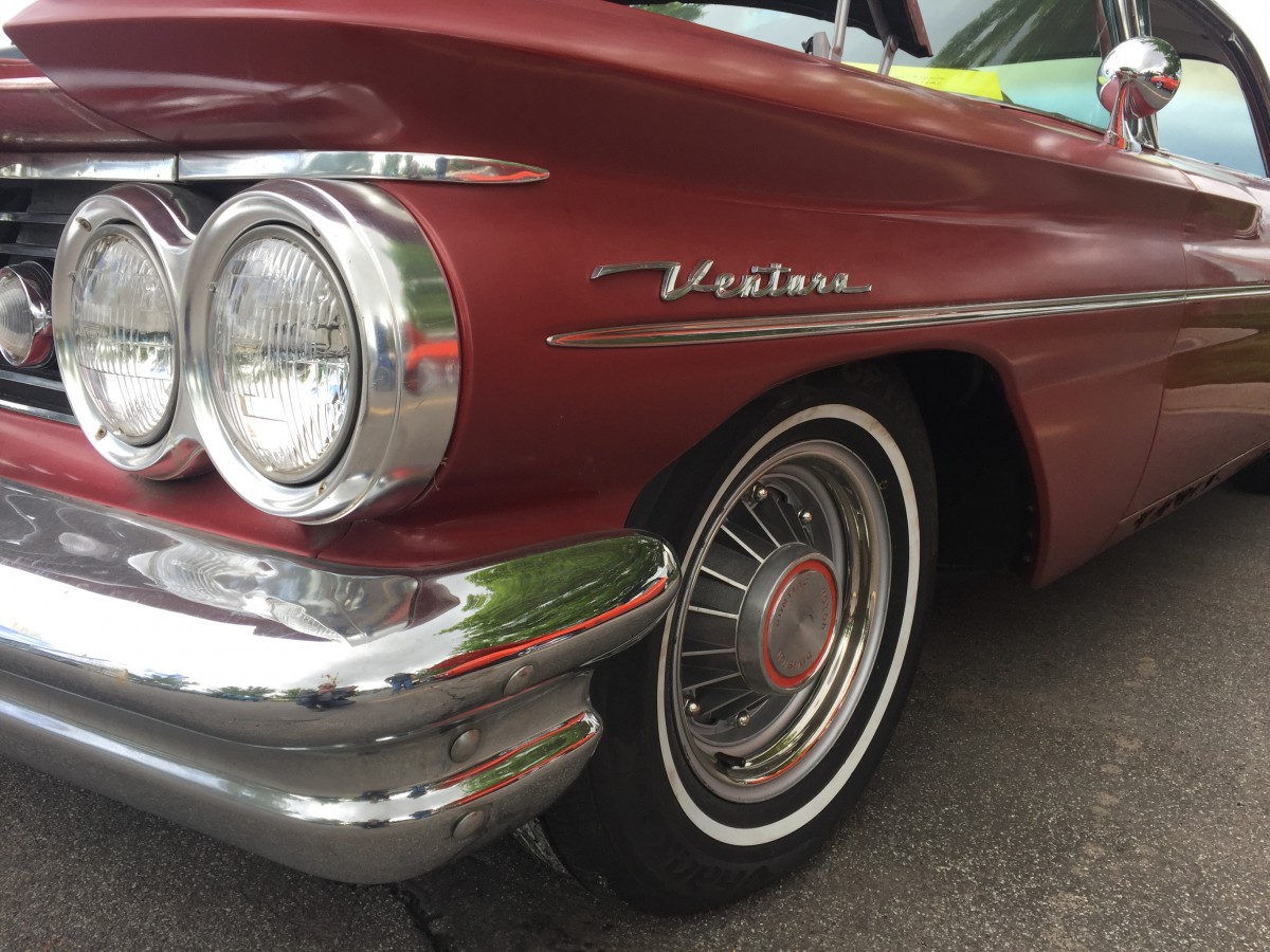 What Makes It Special? This Ventura is a survivor with some restoration to make it drivable. In March of 2015, the car was dragged out from a garage where it had been tucked away in the late 1970s. Prior to that, in 1975, the car was impounded by Nevada Highway Patrol and listed as an abandoned vehicle. It was sold as scrap to a wrecking yard then resold to the prior owner for a parts car. The prior owner decided to restore it and began by removing the front clip and started with bodywork to the driver’s side front fender. After poorly repairing the rust and sanding the fender he set the car aside and the years slipped by with the car being untouched for roughly 40 years. The car is equipped with power steering, power brakes, three-tone Morrokide vinyl bench seats, SoftRay tinted glass, original windshield, the courtesy light switch next to the radio, speaker switch for front and rear speaker volume control. Original interior. The original padded dash is in poor condition so a metal dash was painted and installed to match the color of the padded dash, then scuffed up to appear aged. The original padded dash is included for restoring. The car is also equipped with a full set of restored original 1960 8-lug wheels and drums with excellent metal brake linings, all new stainless steel lug nuts and trim rings (correct left hand and right hand threaded lug nuts). Center caps are original but someone painted the details red (should be black) but I left them that way for that 1970’s touch.