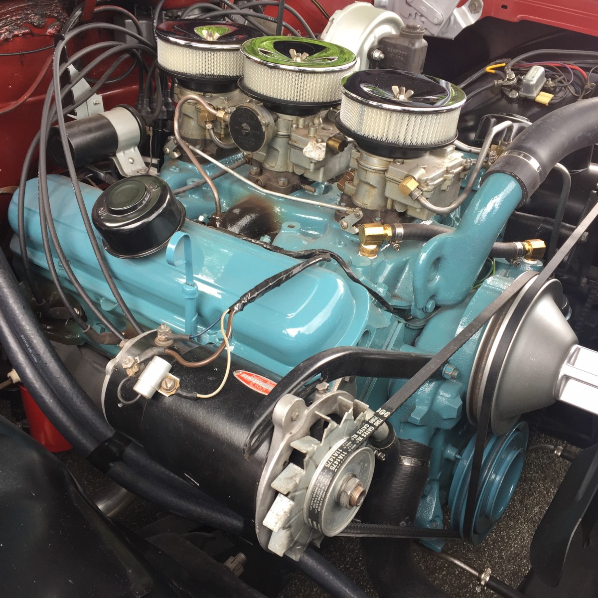 Mechanical Condition: My original intent was to assemble the car and keep everything as an untouched survivor but due to metal fragments in the original oil the engine was removed. The prior owner’s parts car had a very smooth running, low mileage engine that was to be swapped but once the original block numbers were researched I knew that the original engine needed to be rebuilt and reinstalled. The original engine has a matching VIN number to the car as well as being stamped A1, indicating a high compressing rating of 10.25 to 1. With new rings, bearings, cam, lifters, freeze plugs, sealed up and painted to original colors. The Tri-Power carbs and intake were also restored and checked for date codes. The Tri-Power set up is not original to this engine. The numbers indicate that the set is 1959. I’m told that this was a common dealer install to save on time and availability of special order cars as well as the fact that most of the factory-built Tri-Power cars had been going direct to race car teams for Nascar and Drag Racing.