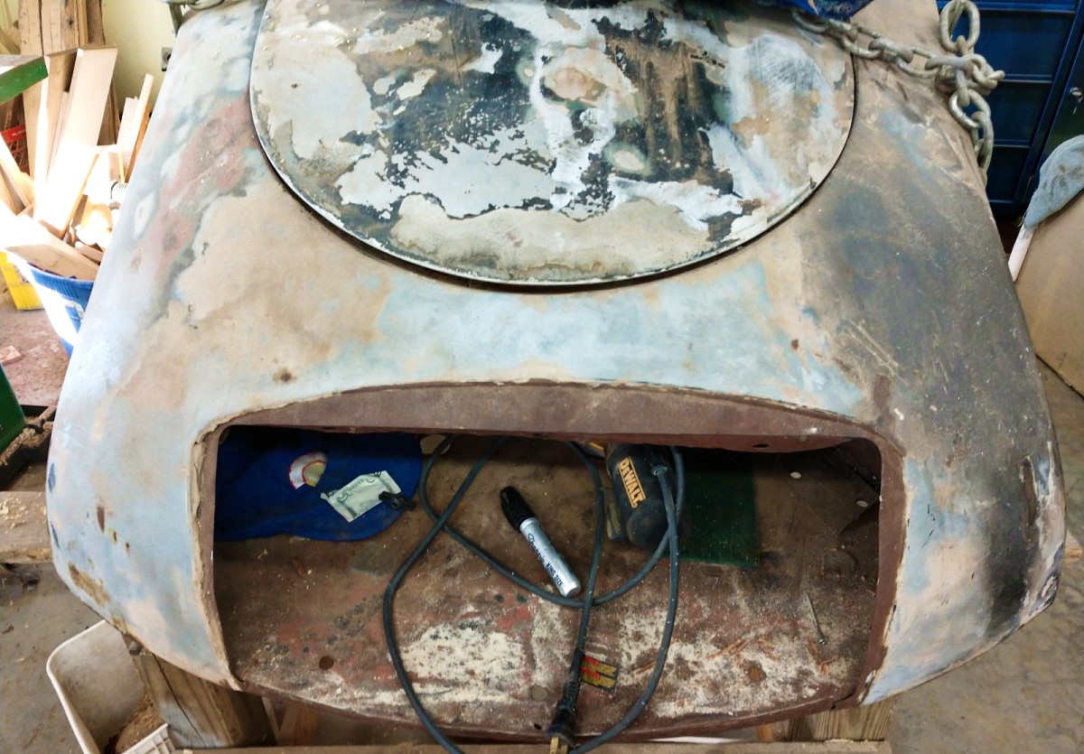 “that roundish thing” is the entire front of the car in front of the cowl, minus front fenders, grille, bumper, valance and apron. The way the photo is taken, I also thought it looked more like a bike’s gas tank. Hood has rounded edges, if that helps give perspective on the overhead shot.