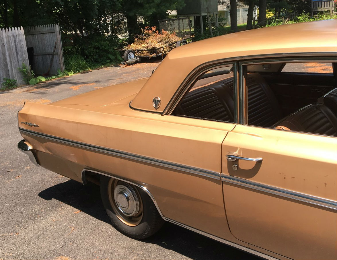 Runs but needs carb rebuild. Exterior paint is faded but has a beautiful patina that only comes with age. Surface rust in front and rear wheel wells. Same around the outside corners of lower windshield frame. There is a long scratch on the upper rear quarter panel and the car appears to have been hit in the rear at one point, and repaired rather poorly. Ethyl, original owner of the car, had some problems getting in and out of her garage. Needs exhaust from the header back.