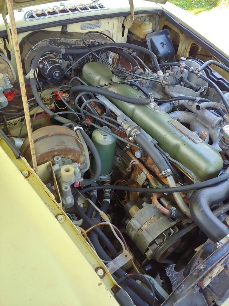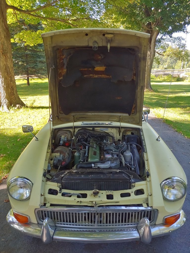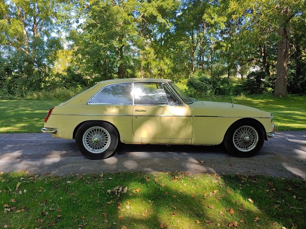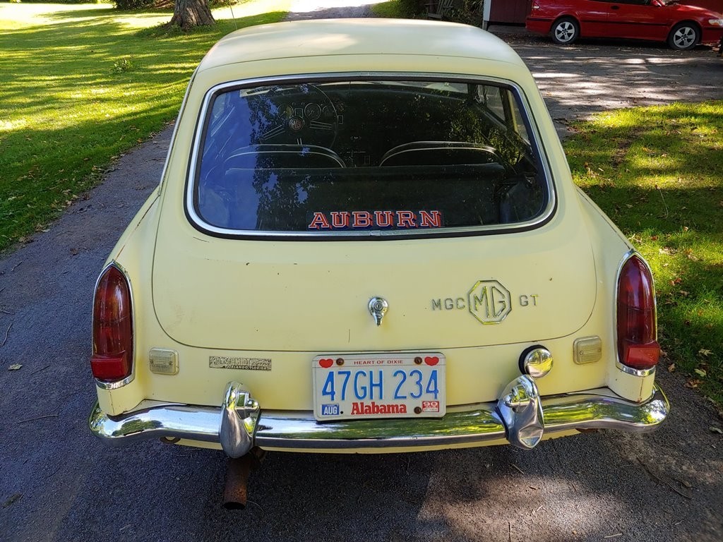 From Elaine – This unrestored, original condition 1968 MGC GT 3 Speed Automatic in Primrose Yellow has been sitting in an Alabama foreign repair shop with a failed water pump, for 32 years! All original interior including ultra-rare vinyl floor coverings. Factory BMC seatbelts, and original banjo steering wheel in mint condition. Runs and drives, with good oil pressure. Still has working original 6 Volt batteries. Brake boosters have been bypassed, but all other braking systems work correctly. Comes with Alabama registration. Many additional photos are available upon request. As is where is.