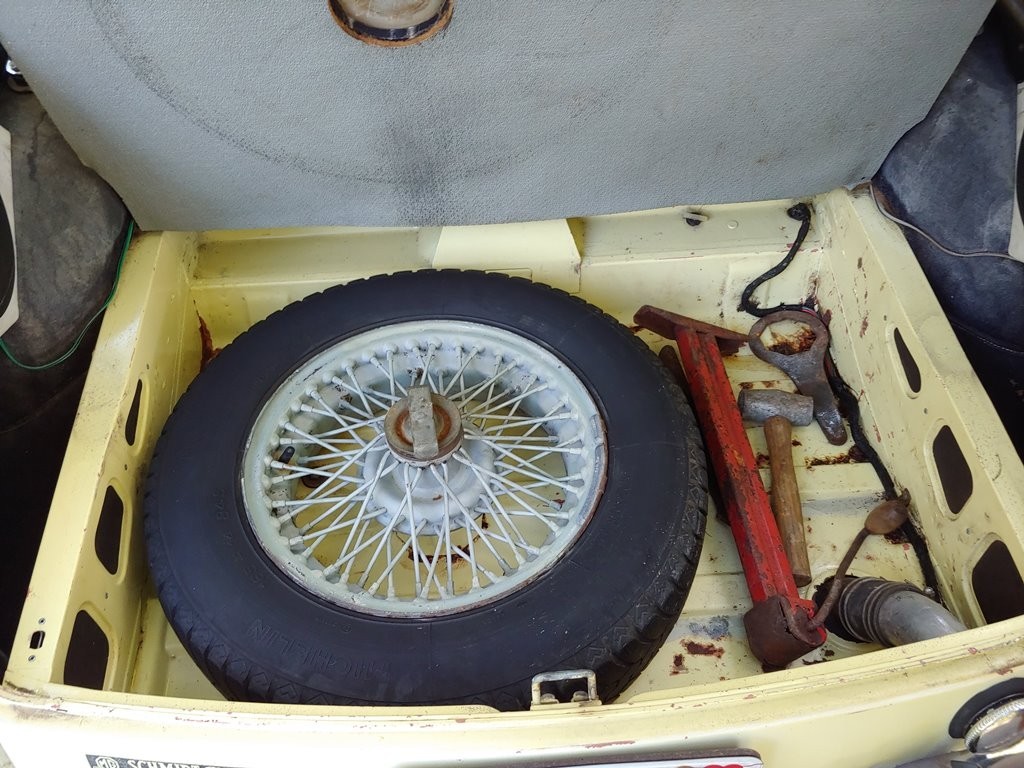 The original jack and tool kit are present with the spare tire.