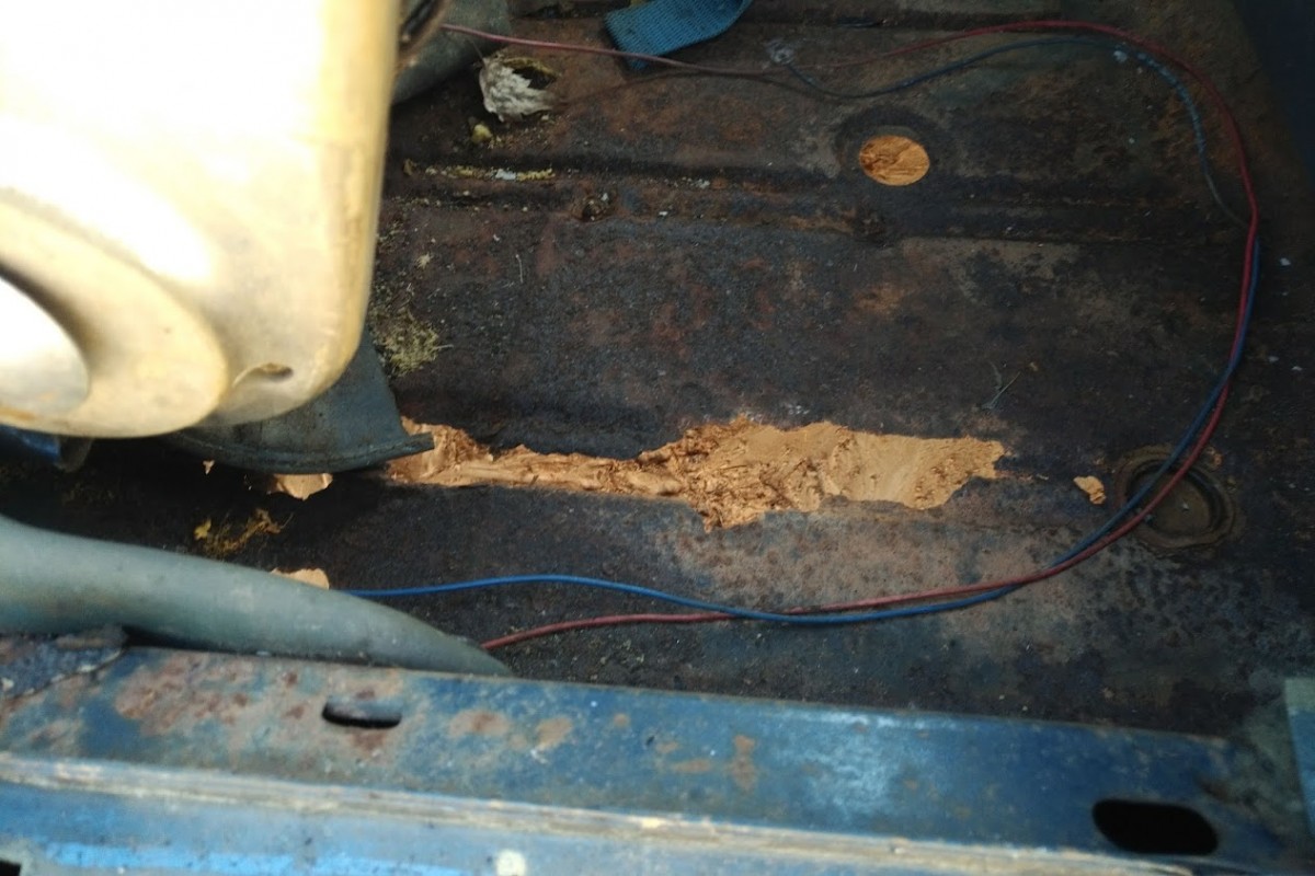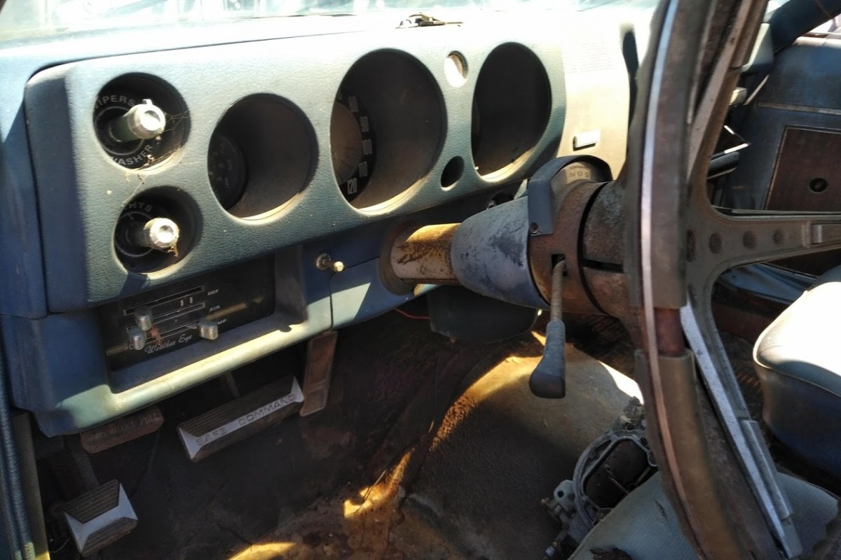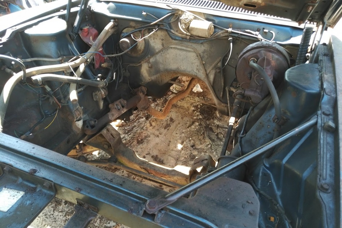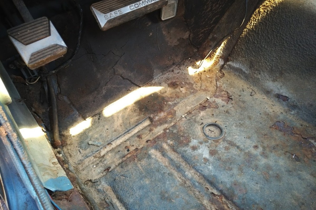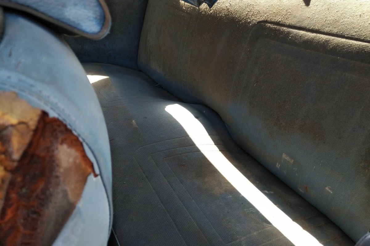The interior features air conditioning and bucket seats. This is the correct, factory color for the cabin, which includes a back seat in excellent condition (see gallery photos below). One issue to note is that the windows need new hardware to keep them upright; they currently do not stay in place. This is the cause for the rot-through on the rear driver floor as noted in the gallery pictures below. The driver and passenger front floors and passenger rear floor are all solid without rot-through.