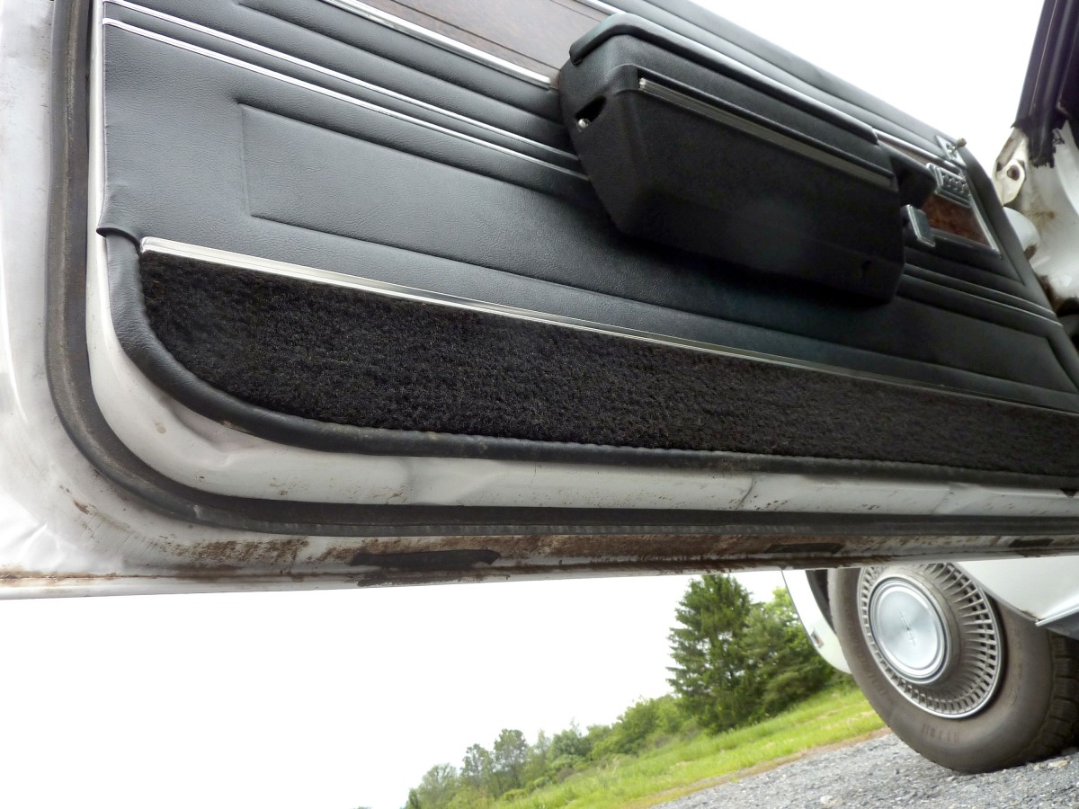 Body Condition: Walking around the car you’ll quickly notice how solid everything is, especially solid is the low areas of the body panels, all around the car (areas which show the first signs of trouble, here in the northeast). The doors are heavy and solid yet show no signs of sag. There are 2 areas of the hood that we have highlighted with photos that show some surface rusting, it appears to be from something stored on top of the hood. The area behind the driver’s door and before the wheel well, just above the mid-body style line is an area about one-foot square that shows some paint failure. You will find a close up of that area provided with the photos. There are small chips and scratches around the car as would be expected for something forty-nine years old and stored for four decades, and the passenger’s door glass is missing, but overall it presents as a really fantastic starting point for easy refurbishment.