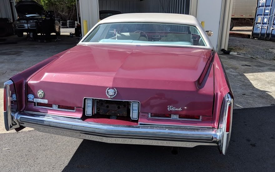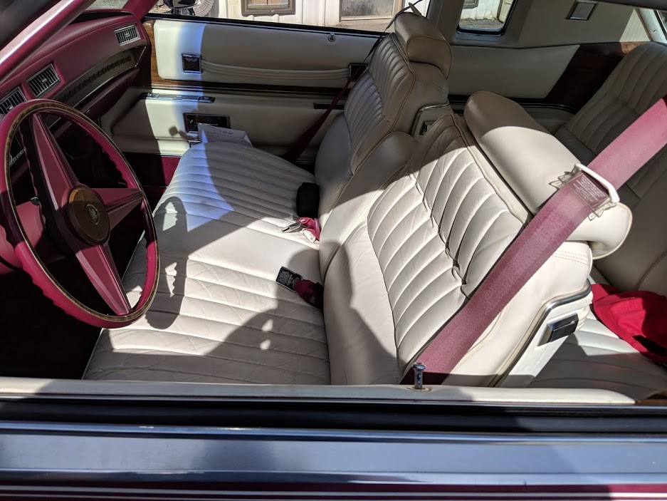 The color is sort of rare if its original, and looks like it is from the matching dash and seat belts, thats Cranberry Firemist Metallic, it was part of the spring edition colors that Cadillac introduced mid 1974.