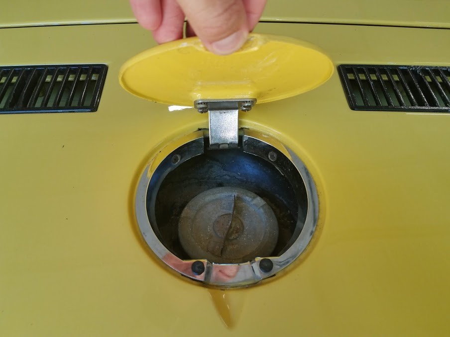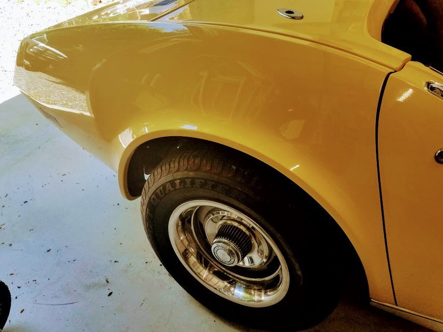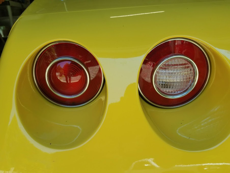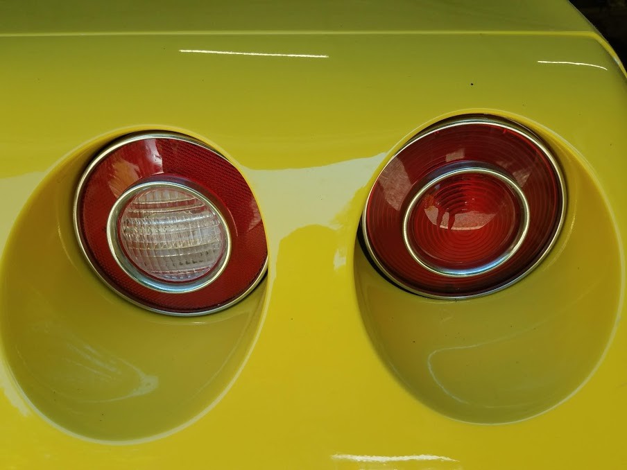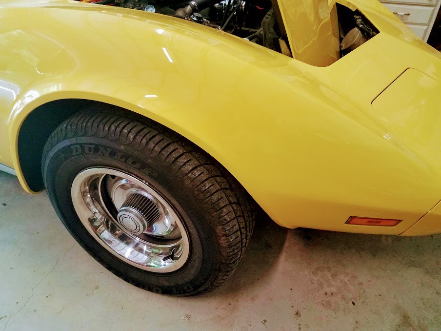 Body Condition: The 1974 Corvette is in excellent condition. I did not notice any cracks or spiderwebbing in the paint or the body. A colleague did mention that the vents front and rear should be body-color; they are currently painted black. The lenses all appeared to be in excellent condition, and headlight doors open and close with ease. The wheel arches showed no damage from rock chips or road debris; wheels are also in very good condition and tires are relatively new Dunlops with no cracking. I did see some older traces of paint on the chrome antenna grommet, but no other significant overspray or orange peel was noted in the paint.