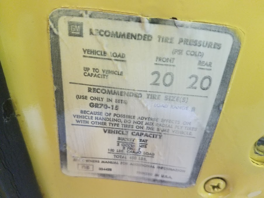 The most intriguing thing to me was the original door sticker on the 74 saying that tire pressure should be at 20 psi. Guess they wanted those old belted tires to ride on the *full* tread, eh?