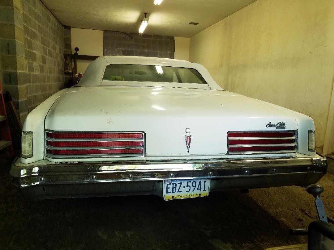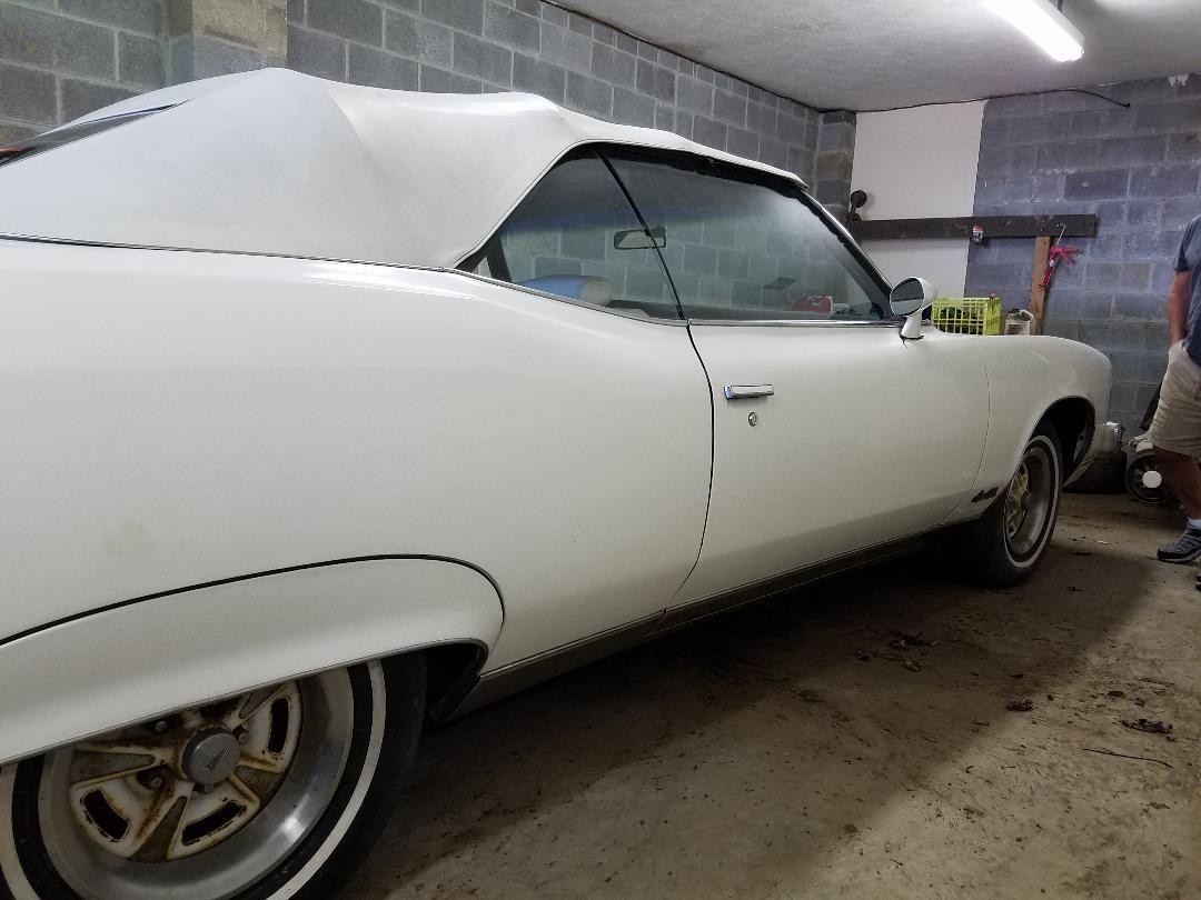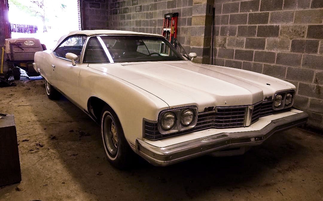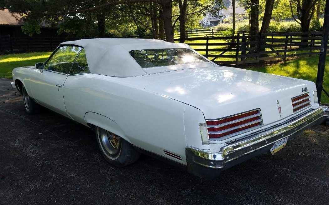 From Jim – This original owner 1973 Pontiac Grand Ville Convertible with 34,000 miles, 455 V8, automatic, runs and drives but needs brake work, tune-up, and some clean up to make roadworthy. It’s a very solid car. I’m Kevin’s good friend and mechanic Jim, and I am trying to help sell this vehicle for him. Kevin bought the Grand Ville Convertible brand new in 1974 and has put just over 34,000 miles on it. He drove it regularly as a Sunday cruiser until around 1990 when he parked it in the garage and has not really driven it much since. The 455 engine fired right up when we put a new battery in it and some fresh gas, although the carb will likely need to be rebuilt, and gas tank and fuel lines drained and cleaned, or replaced. The transmission shifted fine into forward and reverse, but should be flushed, brakes will need some work, looks like a bad master cylinder.