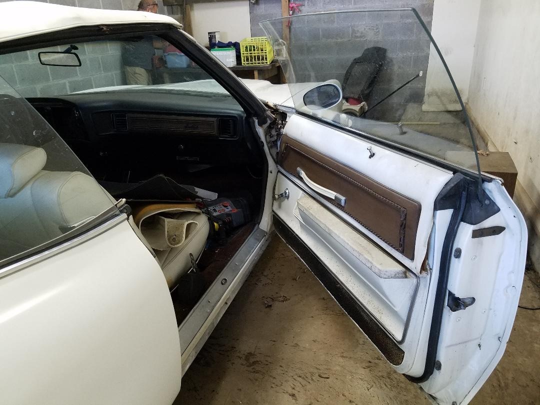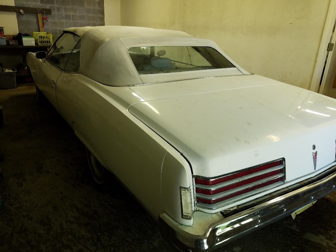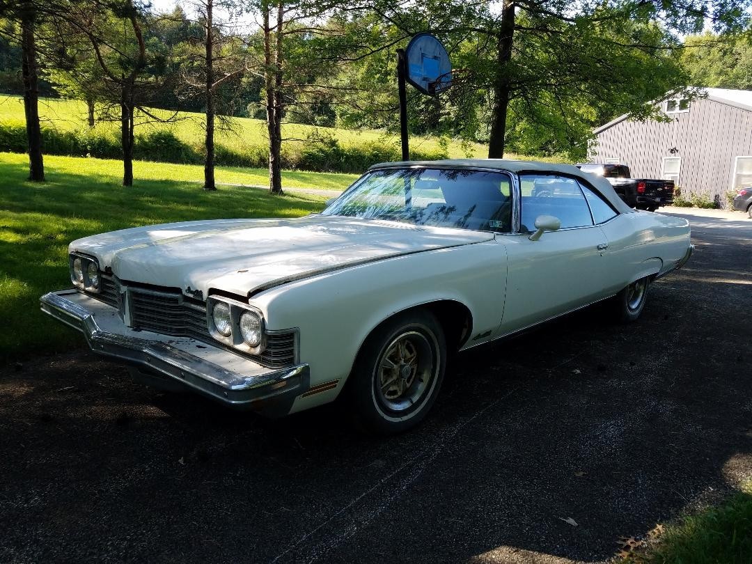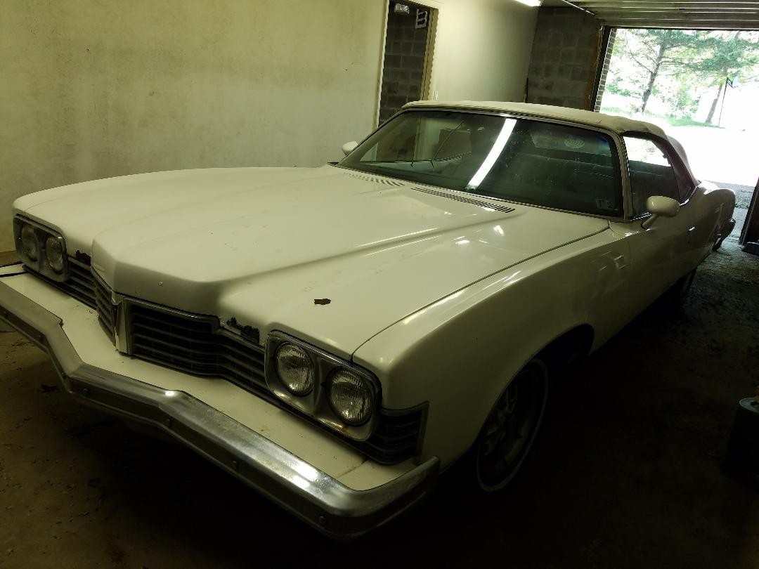 From Jim – This original owner 1973 Pontiac Grand Ville Convertible with 34,000 miles, 455 V8, automatic, runs and drives but needs brake work, tune-up, and some clean up to make roadworthy. It’s a very solid car. I’m Kevin’s good friend and mechanic Jim, and I am trying to help sell this vehicle for him. Kevin bought the Grand Ville Convertible brand new in 1974 and has put just over 34,000 miles on it. He drove it regularly as a Sunday cruiser until around 1990 when he parked it in the garage and has not really driven it much since. The 455 engine fired right up when we put a new battery in it and some fresh gas, although the carb will likely need to be rebuilt, and gas tank and fuel lines drained and cleaned, or replaced. The transmission shifted fine into forward and reverse, but should be flushed, brakes will need some work, looks like a bad master cylinder.