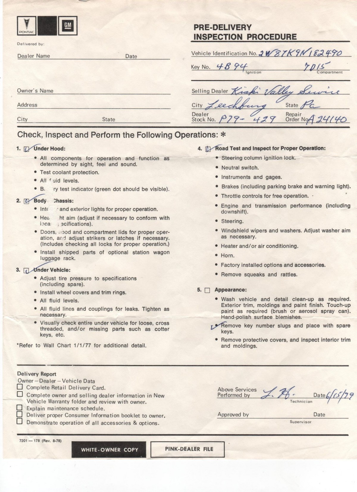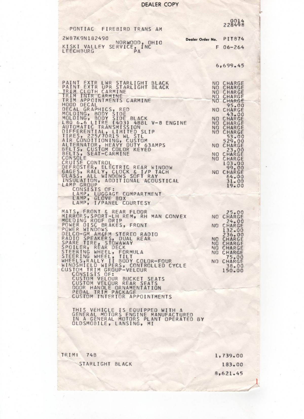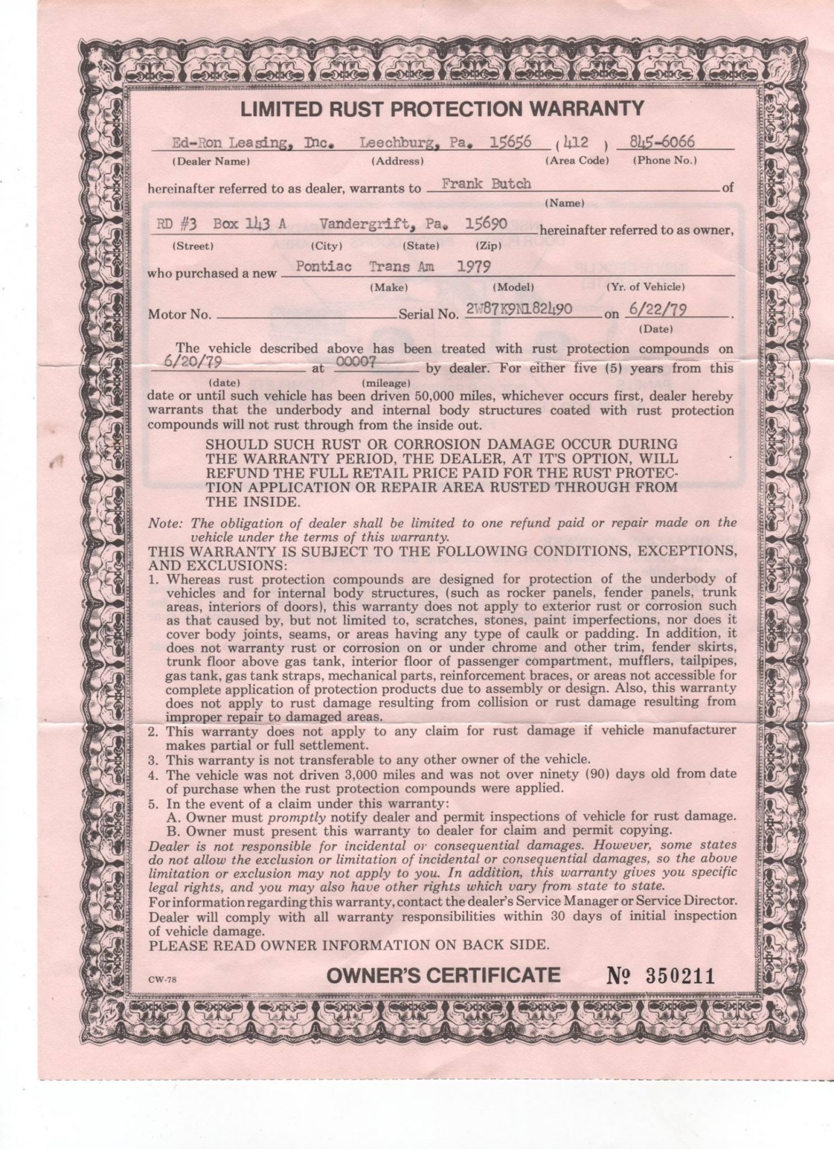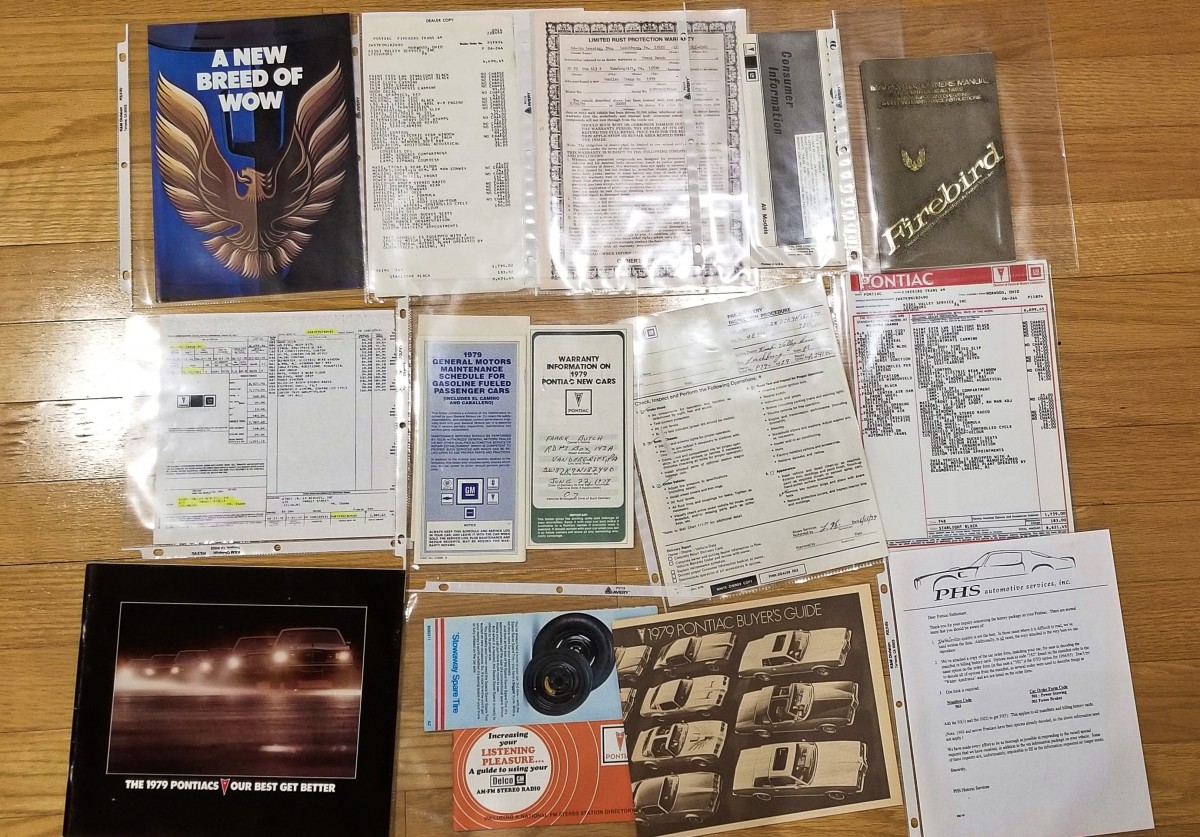 What Makes It Special? This car has never left a little town of 3k people in Leechburg, PA in its 40+ years of existence. The car was purchased in Leechburg from a Pontiac Dealer by the name of Kiski Valley Services, they closed shop in the early ’80s. The car has only had three owners since new, I am the third owner. I have all of the paperwork, warranty, owners manual, undercoating documentation, and 1979 brochures. When I bought it, I only put about 250 miles, yes only 250 miles, or about 50 miles a year. It’s in highly original condition with original floor mats, undercoating, spare tire, and paint making this car a true survivor. The color combo is rare with the black with red interior and red/orange Bird. The only item that is not original are the wheels. The original Rally II wheels were replaced with Red Bird wheels due to one rim having been bent and the original owner replaced them with these great looking Snowflakes rims. The car is PHS certified