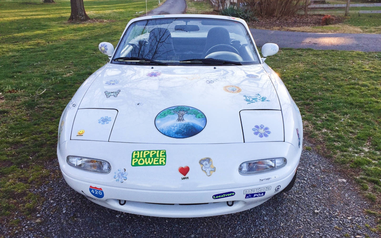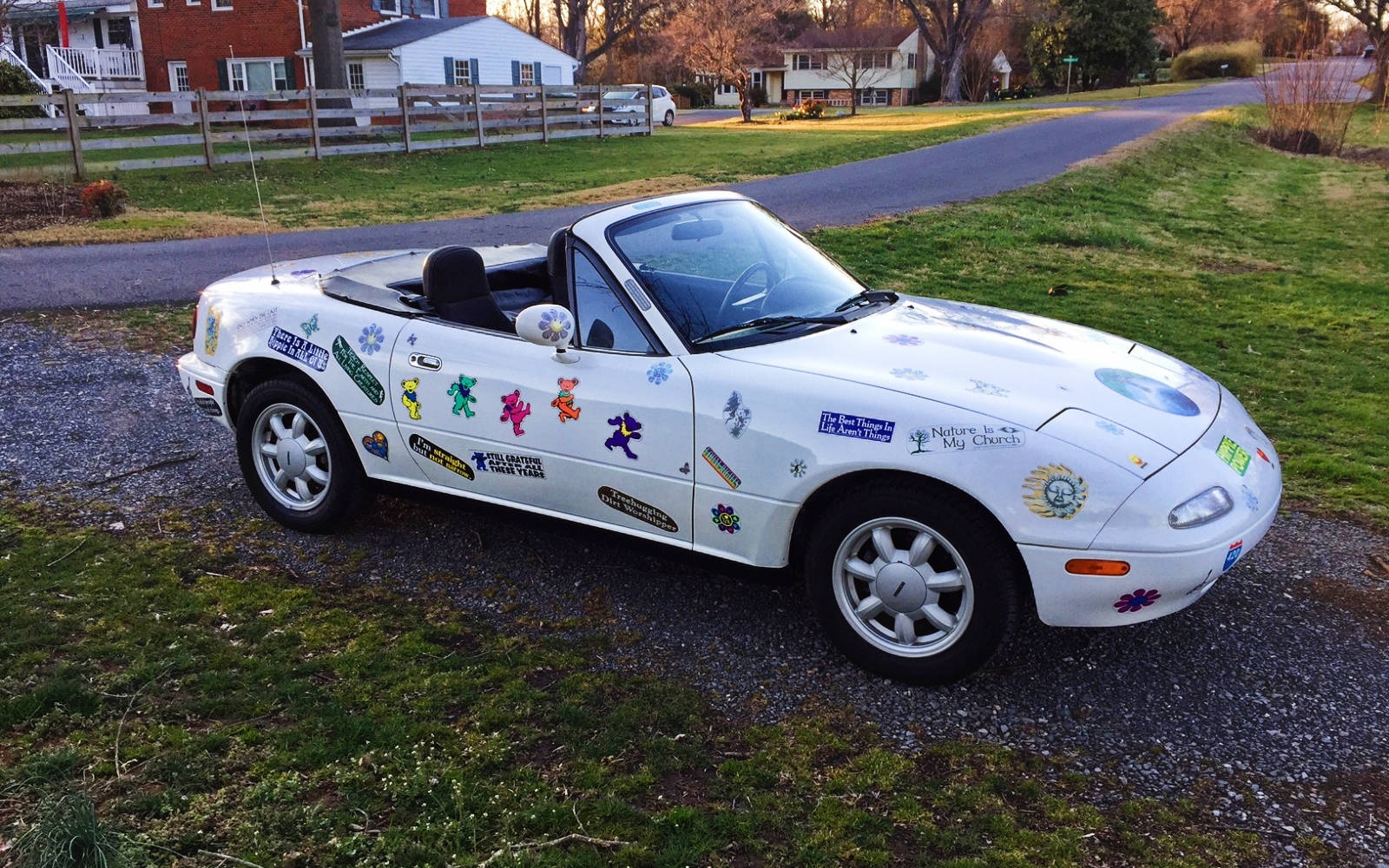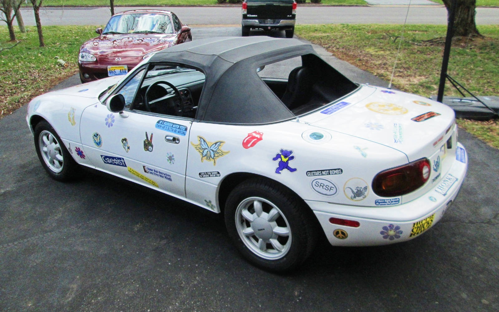 I’m not so sure about the hippy stickers. Personally, those would be the first things to go and as long as the car hasn’t spent much time outside, removing them really shouldn’t be much of an issue. The damage to the door is a bit of a bummer, but you might be able to find a replacement from another car that matches. With that fixed, it would be like new! Clearly the seller, Scott K, is a Miata fan and has several other beautiful examples in his garage.
