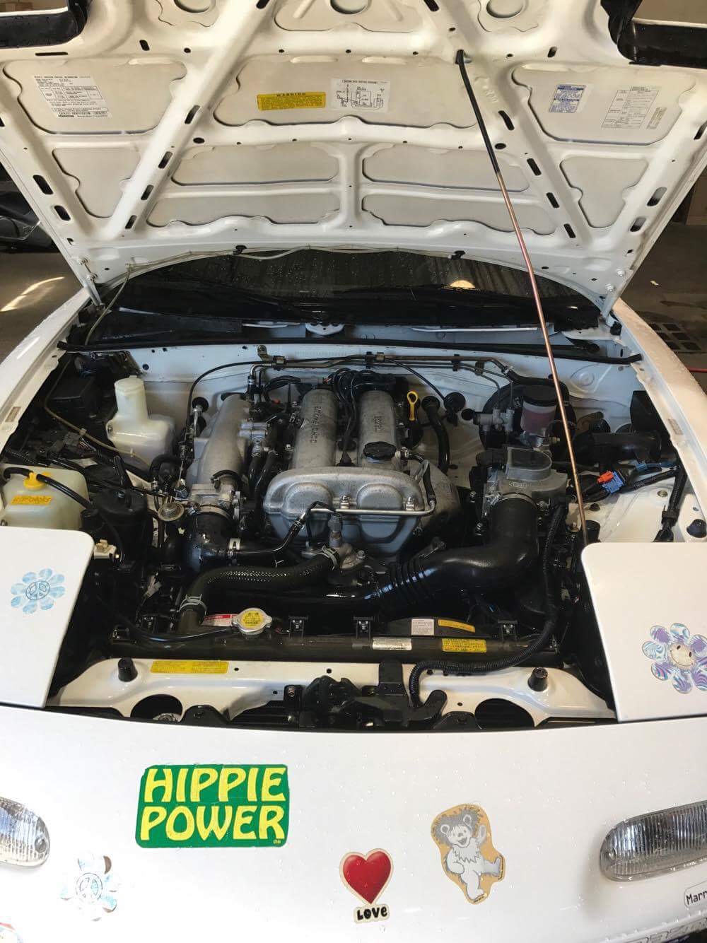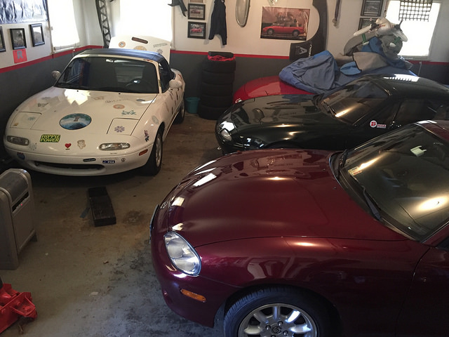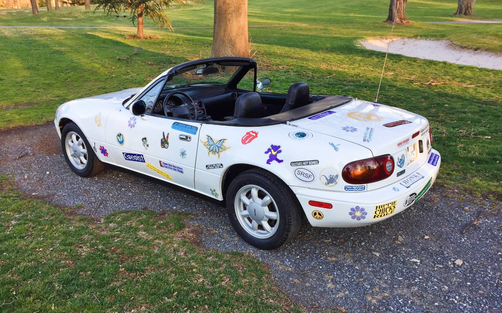 I’m not so sure about the hippy stickers. Personally, those would be the first things to go and as long as the car hasn’t spent much time outside, removing them really shouldn’t be much of an issue. The damage to the door is a bit of a bummer, but you might be able to find a replacement from another car that matches. With that fixed, it would be like new! Clearly the seller, Scott K, is a Miata fan and has several other beautiful examples in his garage.