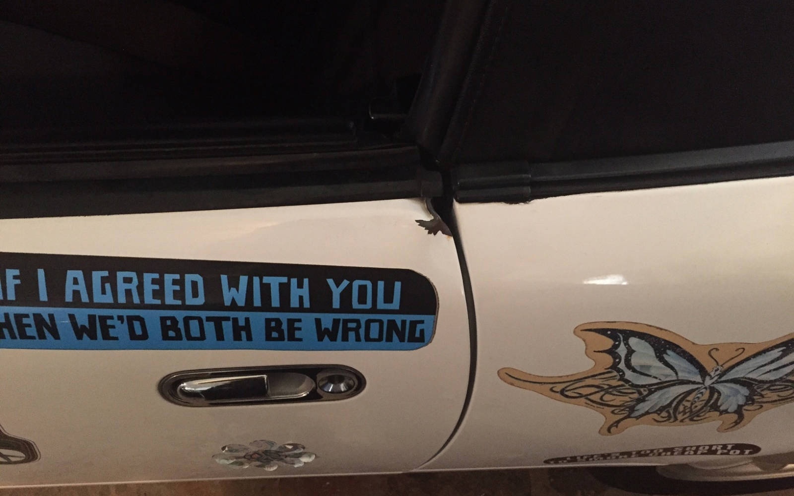 It’s going to take some effort to get the stickers off without hurting the paint, I’d suspect the interior is permeated with the stench of patchouli oil as well, not sure of a remedy for that short of burning.