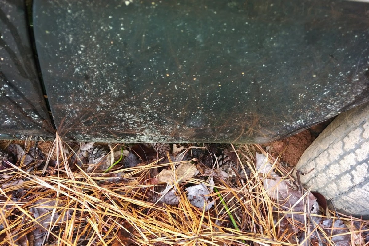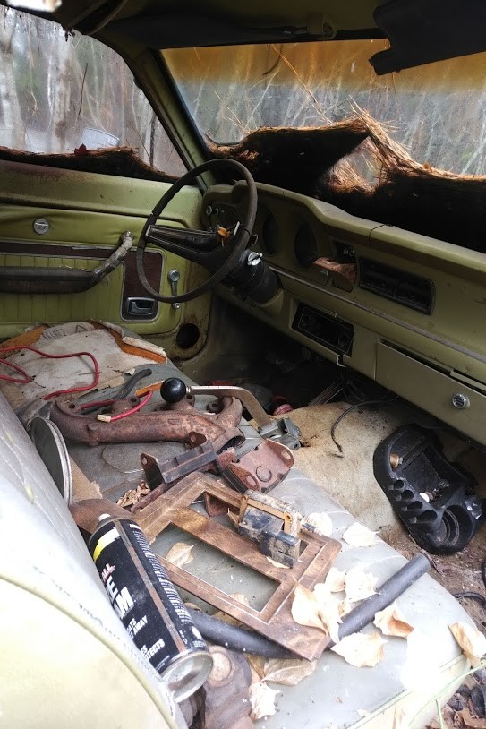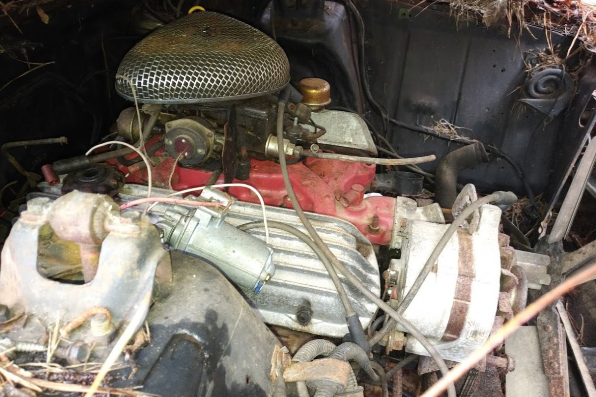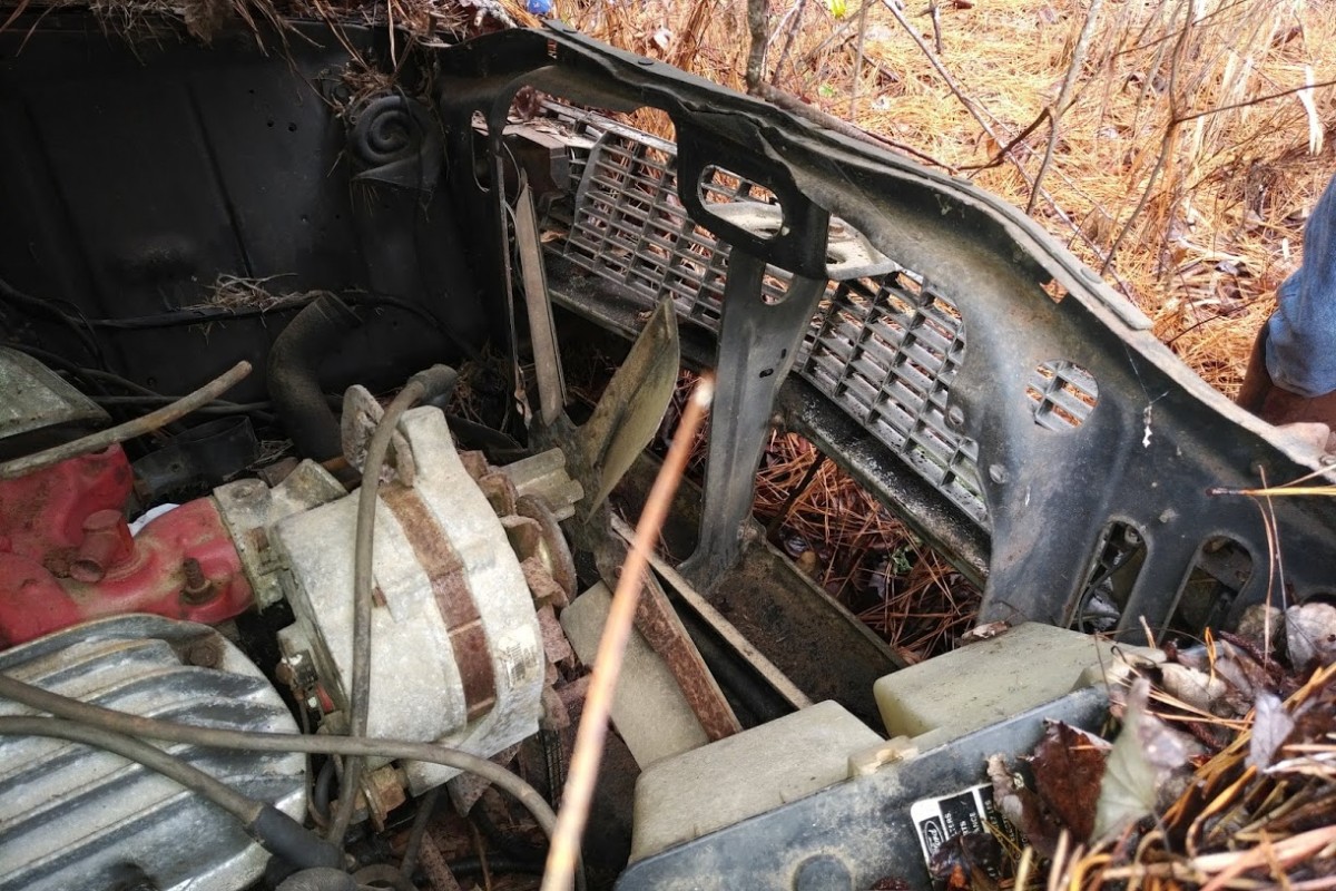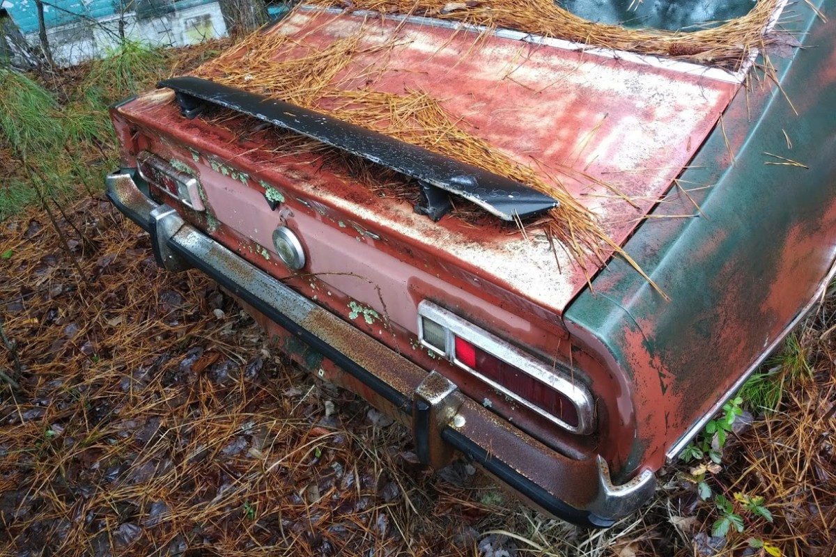 Pine needles and sitting on the ground doesn’t bode well for the underbellies. Looks like the window is busted on the multi colored car, kiss the floorboards good by, Do like the small block and cal custom valve covers. Need to be moved for full inspection, You would need to be brave to take these on. Good luck…you think a rustang is bad–these rotted out while on transport to the dealer…