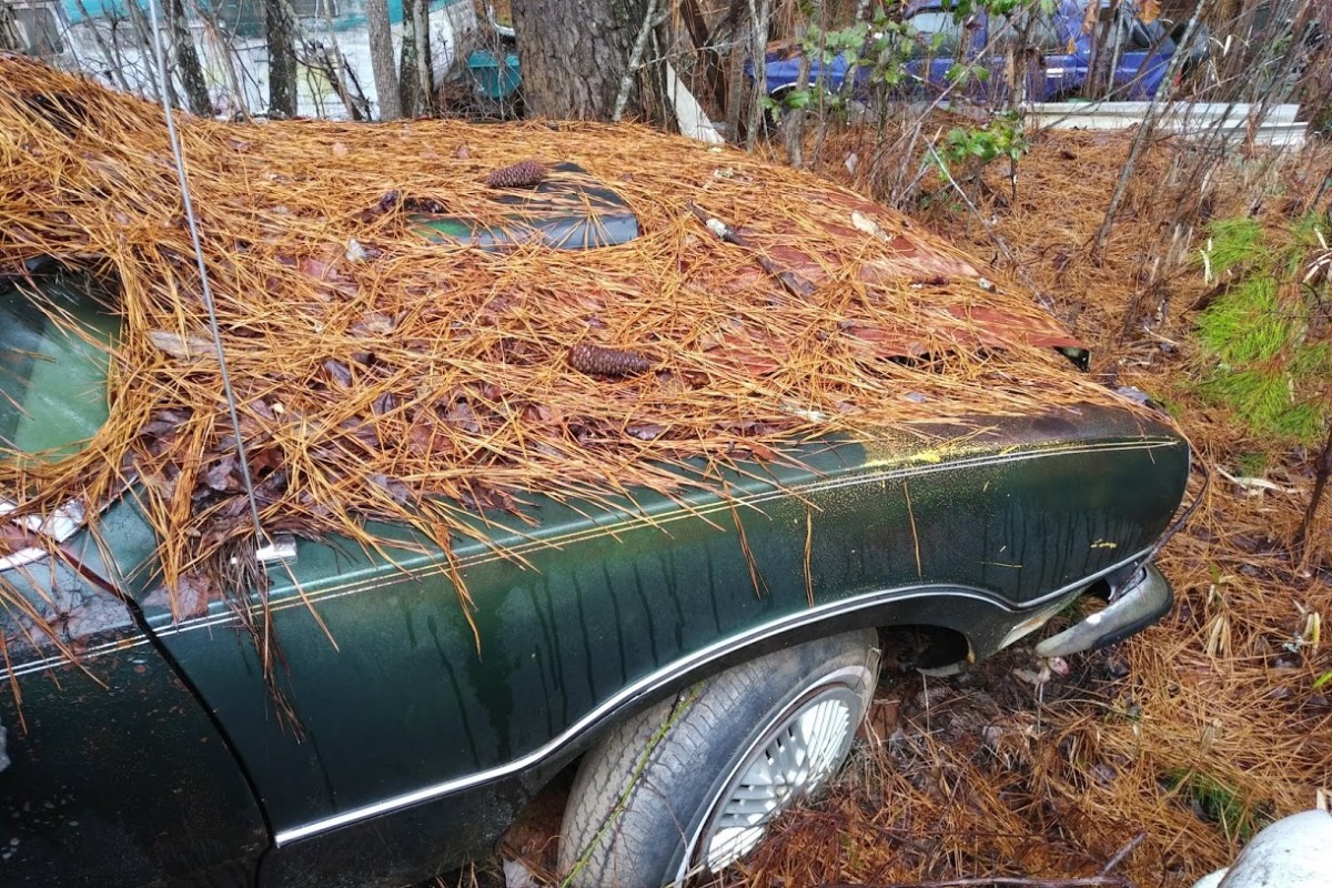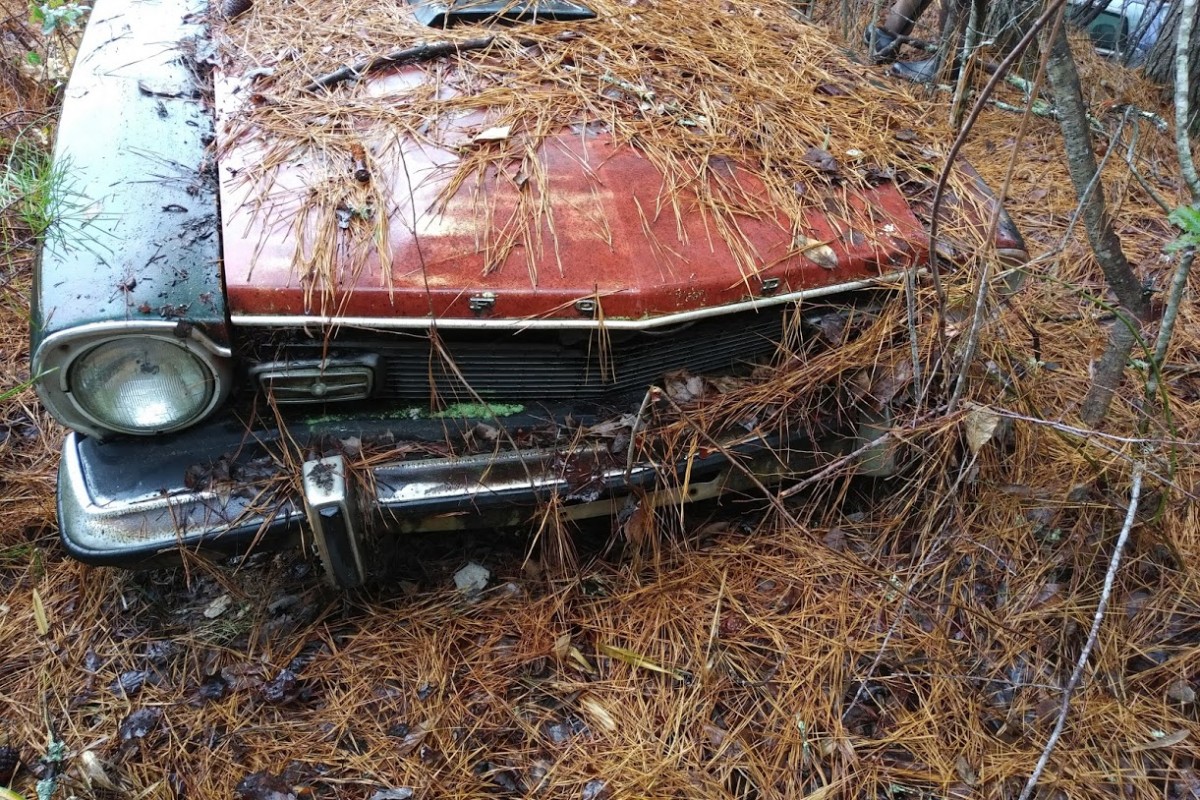 Front end damage, missing parts, covered in wet pine needles and sunk into the ground on rotten tires. These cars need to be pulled out and cleaned off/out to be correctly evaluated.. to many unknowns.