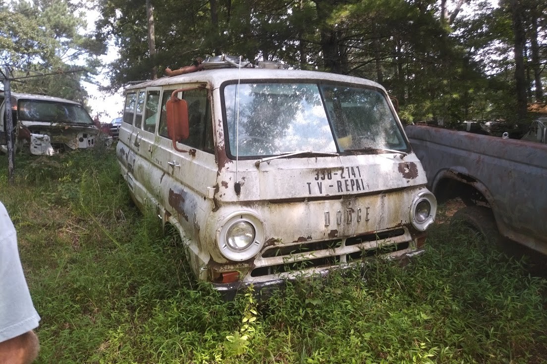 Elsewhere on the property is a nice collection of Ford Econoline vans, similar to the camper conversion above. This Econoline will need a front axle, but the seller will install one prior to delivery for any interested buyers. In addition to the Econolines (there are at least two others), Mopar fans will find a few Dodge A100 vans to choose from, including a wicked period-cool RCA TV repair van.