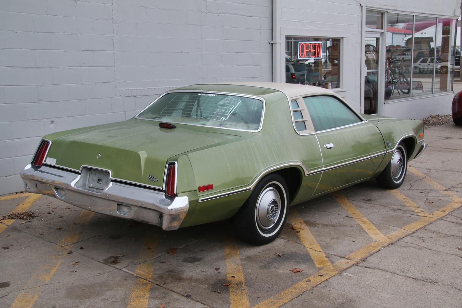 We then walked over to his main showroom where a team of folks were busy helping customers with their vehicle inquiries. In the showroom sat a 1964 Cadillac Coupe DeVille (which isn’t for sale), a 1955 Thunderbird, and a perfect 1935 Chevrolet resto-mod with matching teardrop trailer! Along the edge of the showroom were several perfectly-restored small parade-type cars, a museum-quality bumper car, and a reproduction Schwinn Whizzer. Parked outside was an original 1975 Dodge Charger Sport with the split grille in classic 1970s green and in great condition; one-owner.