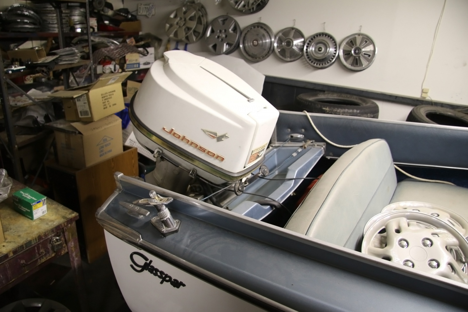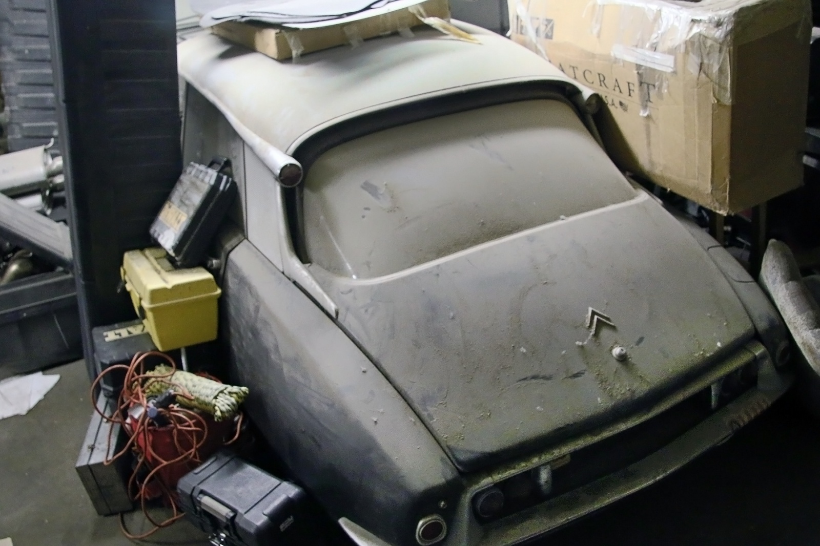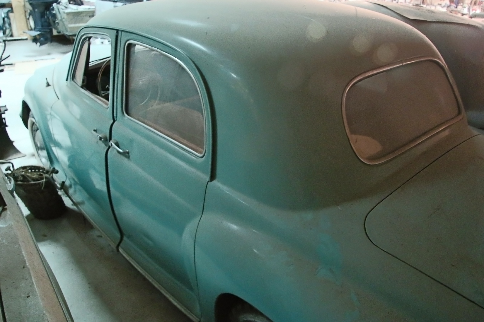 In a building in back of the showroom was a Citroen DS in what appeared to be very nice condition, but it was partially-covered and surrounded by parts and other things. Also there was another perfect boat in there.