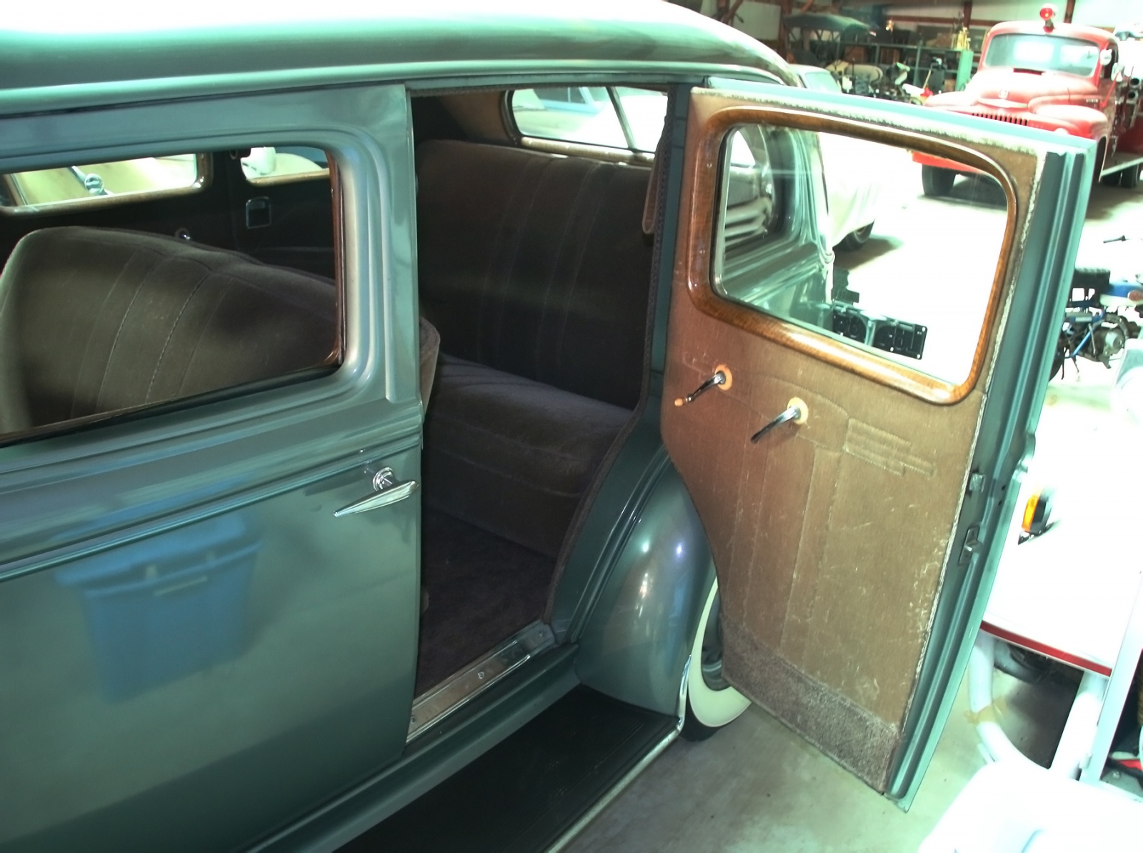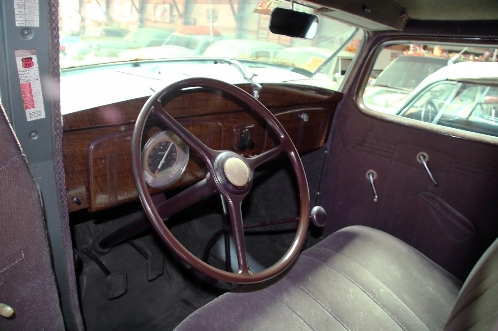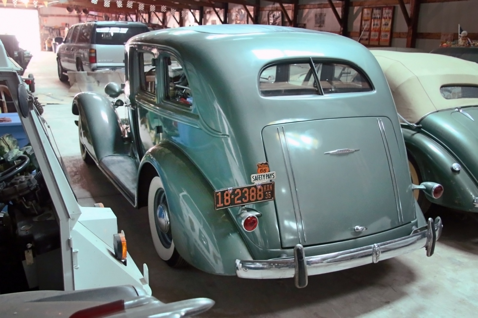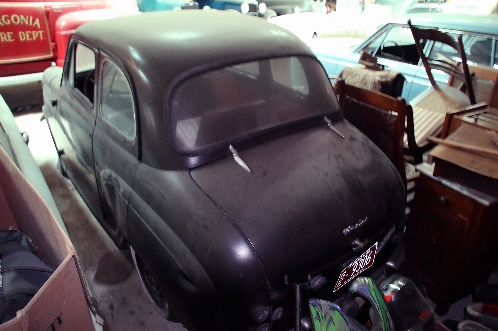 Here are the highlights and I haven’t looked at the whole video yet because I have very poignant memories of that day and I want to write them down first. Walked to that blue barn and at that time there was a railroad car or two parked outside. Then when he opened the door there was an actual museum. No sign, nobody knew they were there but it was an actual museum. First one I remember was a 32?, 34? LaSalle that he took on his honeymoon. On the left side of the display was a T-bucket with Edelbrock valve covers which were vintage even then. I remember a fire truck from a town that he bought when the town was being cleared out to flood it with Tuttle Creek reservoir.