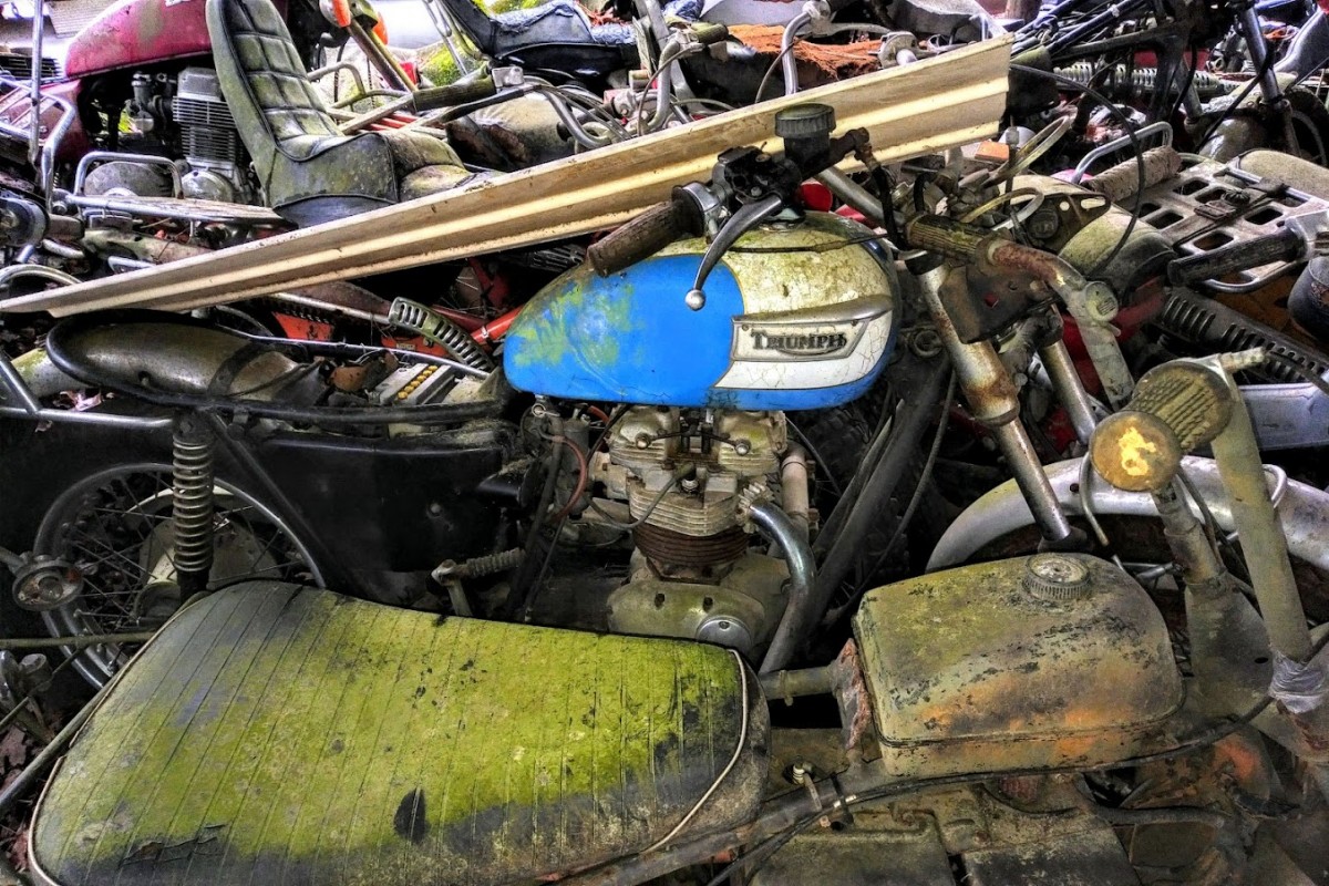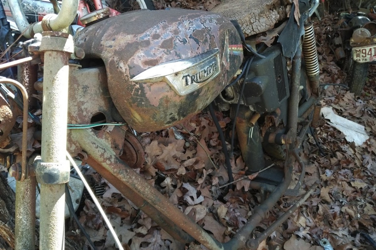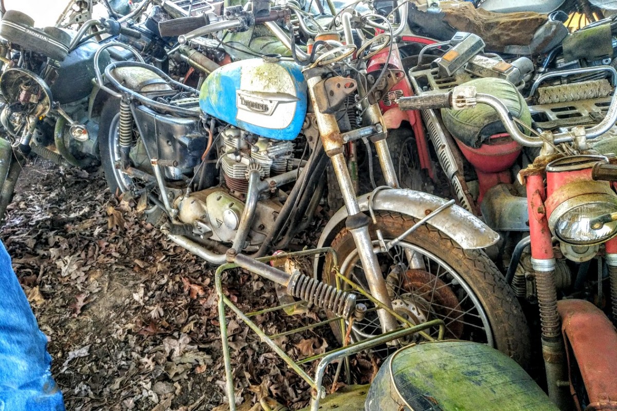 I agree, some fun stuff, except, having them outside makes them more of a project. By looking at this, it’s amazing how many motorcycles were bought and ridden, and then, nobody wanted them, and they end up in piles like this. I think the oddball dirt bikes ( Rickman, Maico) will be worth having, because they are so rare, the Suzuki GT380,( probably stuck, time sitting is not kind to 2 strokes) Suzuki was one of the last to run 2 cycle street bikes, and the Triumphs, always neat, no matter what condition. Parts, like CDI boxes and seals, engine parts, could be a hassle. I’d say the Triumph is the best of the lot.