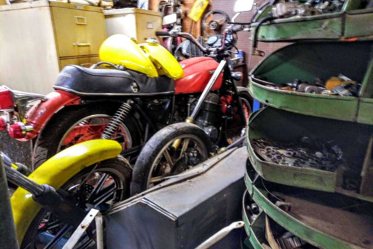 The nicely kept red Honda (garage or shop) looks like a 550 or 750F?