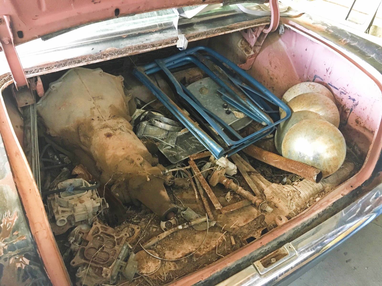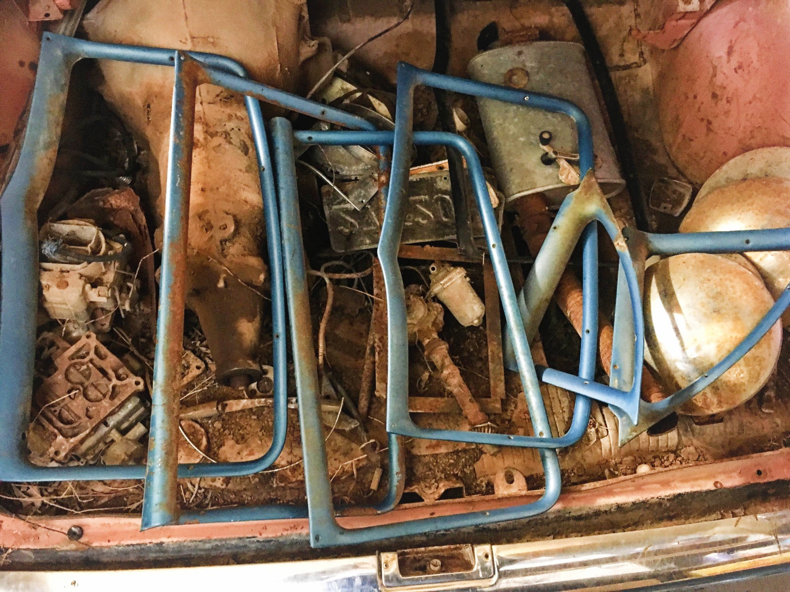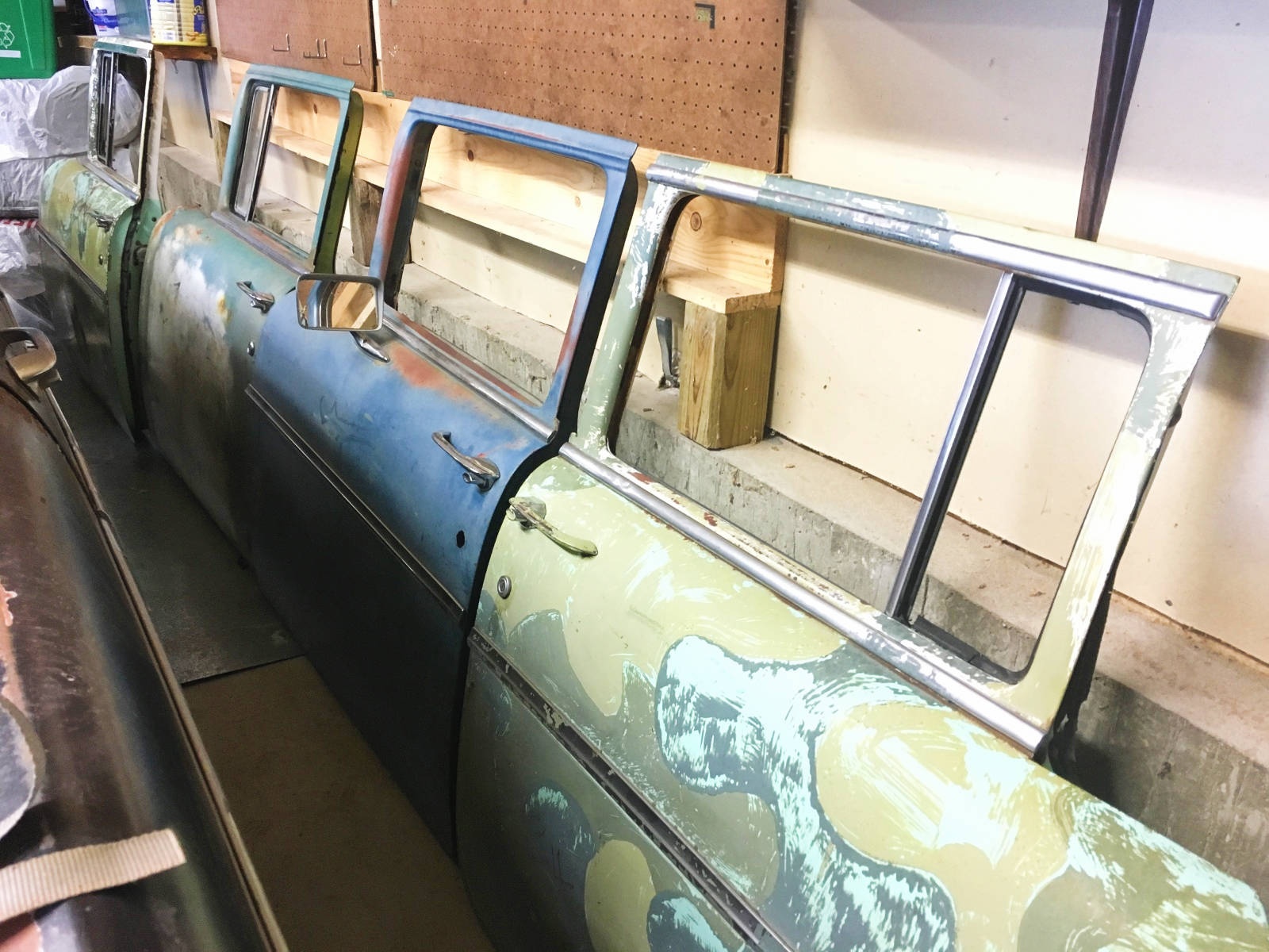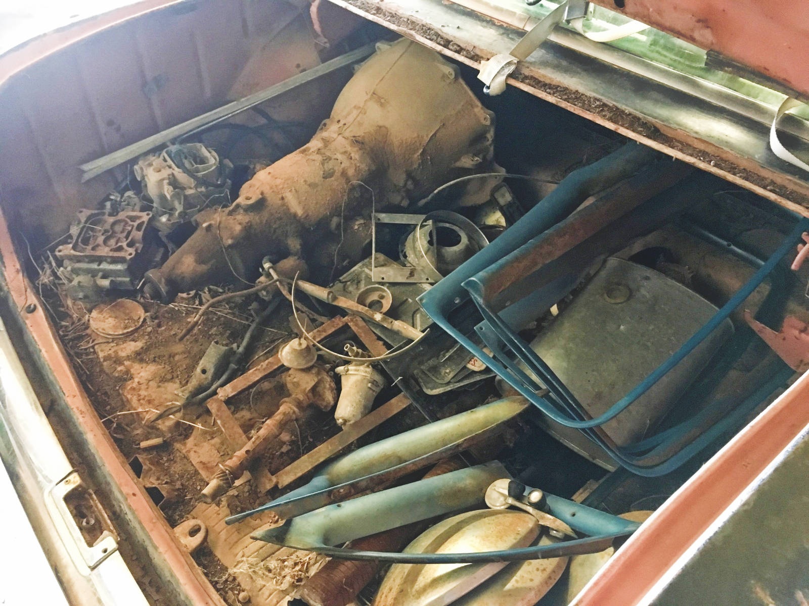 1957 Chevy 210 4 Door Sedan – No engine, transmission in trunk (looks like a Turbo 350, but have not removed to inspect closely). Car is a 210 that has had a rough Bel Air makeover. Needs a floor pan and drivers door window. No Keys – Clean Title Other Items – 7 complete Tri-5 doors (one of the seven is missing chrome and glass). One complete set of window trim, full set of baby moon hub caps, 3 extra original wheels, two carburetors, and a few other random parts.