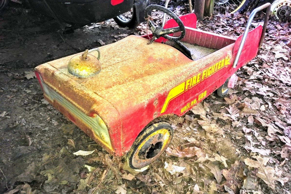 I thought this was cool: an original AMF pressed-steel firefighter pedal car! This was found in the trunk of another vehicle and is in restorable condition (or use as-is if you like the patina). The pedals are there and still spin freely. The original siren is missing, but the bell is still with the pedal car. If there’s a pedal car collector out there, I’d love to see it find a good home.