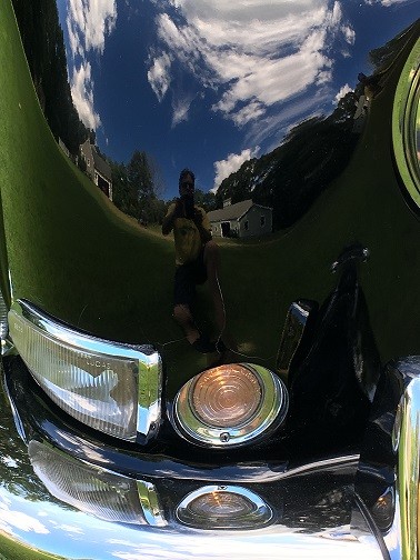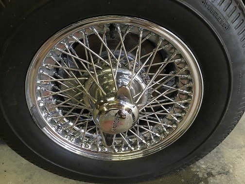 Body Condition: Overall the black paint is presentable with a deep shine although there are some road chips but no rust. The underside of the vehicle shows solid floors and no rust issues. There is a small crack in the paint over the front right turn signal that appears to be where the paint separated. There is also a chip on the passenger front door. The bumpers have been re-chromed along with other trim pieces. The door window trim as well as the front and rear window trim are presentable but have not been re-chromed. Wire wheels are in presentable shape with the chrome showing well with slight pitting on the center sections of two of the rims.