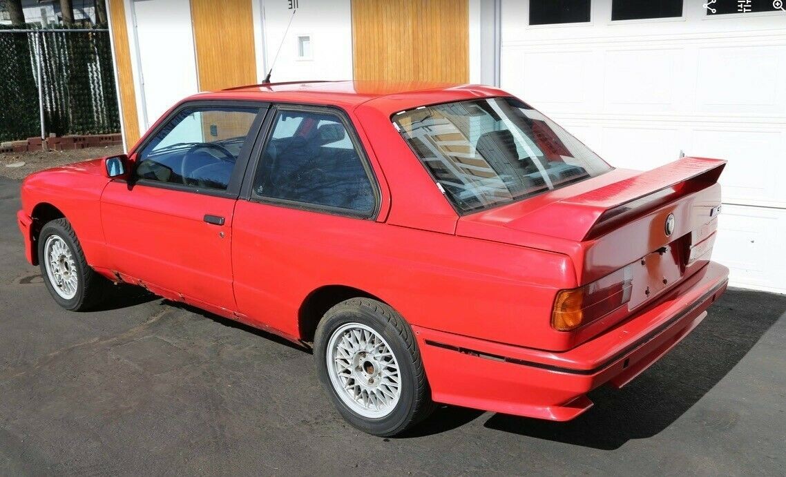 Now, the seller is explicit in stating that there’s no interior and no drivetrain, and that the battered M3 comes as pictured. The car does show an interior, however, with a dash, full carpeting, door panels, and even the original audio system still in place. Yes, the factory sport seats are long gone, replaced by the standard buckets from a lower-trim model, but it’d be worth clarifying with the seller whether he has stripped all of these parts since the photos were taken. If you were starting with the pieces shown here, it’d instantly become a more manageable project.