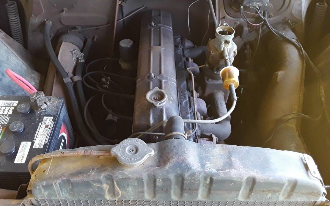 The interior is an interesting site at first glance, especially with a blanket seat covering advertising a state that has been getting a lot of TV air time as of late. I’ll take that to mean that the seat upholstery is shot. It’s difficult to make out anything else inside though the radioless dash and instrument panel look original and complete in their minimalist way. The dash-mounted compass is certainly a nod to a bygone era. I’m not sure what the railroad lantern is for, possibly no interior lights?