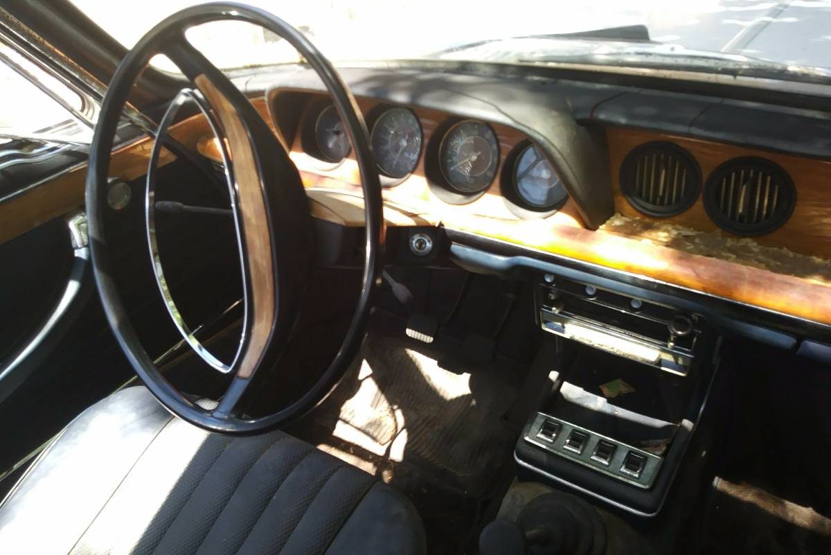 The interior is described as being similarly complete, and the car sports a sehr Bayerische white-over-blue color scheme. There’s a fair amount of wood trim in here, though, which will make for a lovely driving environment when restored, but will be costly to get to that point. Aside from being dusty, though, overall the interior looks remarkably intact; I wonder how many miles this car racked up in the seventeen years before it was parked.