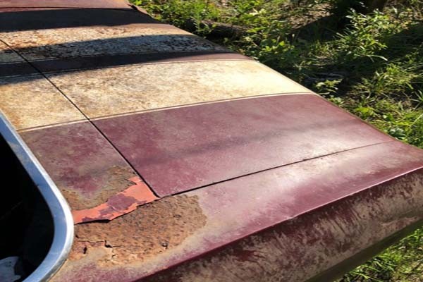 The paint was at one time dark cherry as designated by the 78 on the VIN, which is still a visible part of the VIN. The best view of the paint is on the trunk. The iconic white stripes are still visible as well. One can see a hole in the rust near the window trim. Surface rust would be a relief but alas, that is not the case.