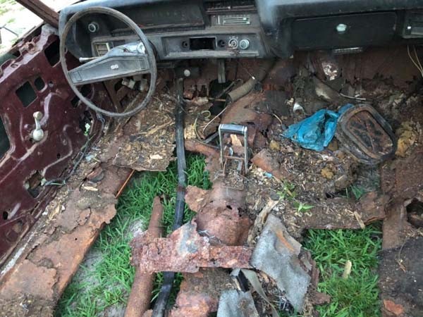While this 1970 Chevelle convertible does not say it was ever on fire, years of exposure to the elements make it look like an extra crispy hunk of metal from a rust bucket menu item, if there were such a thing. Having no roof, and either a decayed or missing interior, there are no floor boards or frame anymore. They have eroded away and all that is left is a shell of fenders and doors. You can find for sale here on eBay.