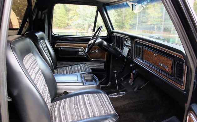 There’s a lot to like about this Bronco’s interior, and little justifying criticism. The all-black theme set by its exterior is continued inside, with the upholstered surfaces featuring that shade in cloth and vinyl. There is no appreciable wear, the carpet is excellent, and the faux woodgrain shows no evidence of deterioration. The dash and pad could be the highlights because they haven’t succumbed to the harsh Texas sun. The first owner equipped this classic with ice-cold air conditioning and cruise control, and the seller added a more modern stereo.