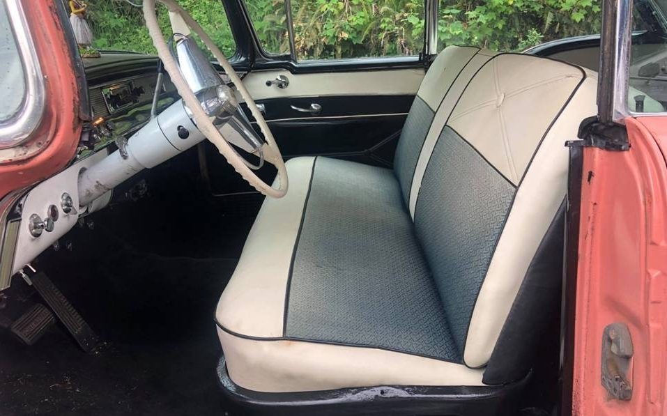 Inside, is a black, white, and gray upholstery combination that perfectly enhances the coral and white exterior – it strongly continues the ’50s vibe. The upholstery is in fine nick, as is the carpet though the door panels appear to show the onset of some wrinkling. Features include power windows, locks, and front-seat though the seat needs a new motor. The radio lights up but doesn’t broadcast but the clock still works – that’s a surprise as they are usually one of the first accessories to quit.
