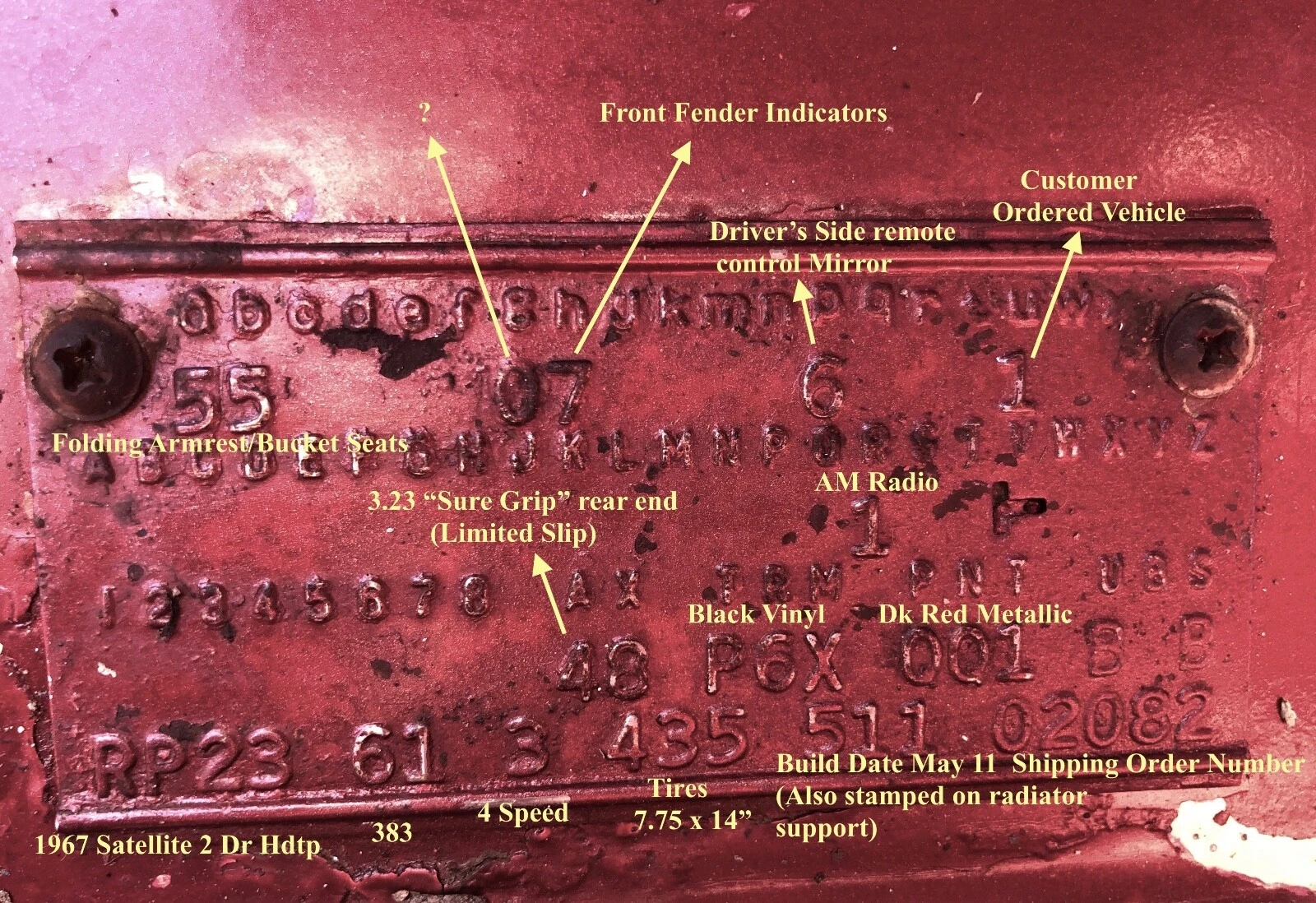 Topping the list of desirable equipment is the engine and transmission combo, which consists of a 383 with a 4-barrel carburetor and a 4-speed manual transmission. Short of the Hemi, this was as good as it got for a ’67 Satellite, with the 383 rated at 325 horsepower. The good news continues, as these are both stated to be the original components, and there’s also a limited-slip rear end out back with 3.23 gears. A previous owner told the seller that the engine has been recently rebuilt, and while there is no proving paperwork, it’s said to be running beautifully with no mechanical work needed. The car was also ordered with no A/C, no power brakes, no power steering, and no side trim. Kudos to the seller for providing a photo of the decoded fender tag.